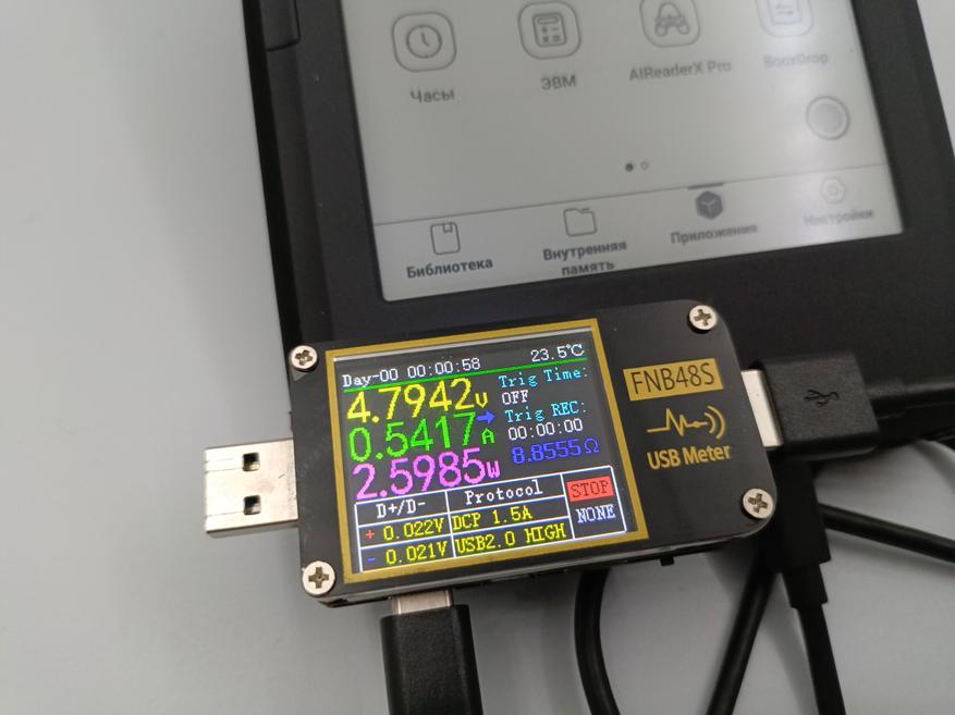 Книга оснащена Li-Ion аккумулятором с ёмкостью 3000 мАч, который обеспечивает до двух недель автономной работы при активном использовании. Это позволяет брать книгу с собой в длительные поездки или путешествия без необходимости заряжать ее. Заряжается книжка с помощью современного USB Type-C разъёма. Во время зарядки книжка потребляет 0.5 А. В комплекте предусмотрен для этого кабель длиной 50 см. Кстати, данный разъём поддерживает OTG подключение, а значит, вы запросто сможете подключить карту памяти с USB A интерфейсом через адаптер или напрямую.