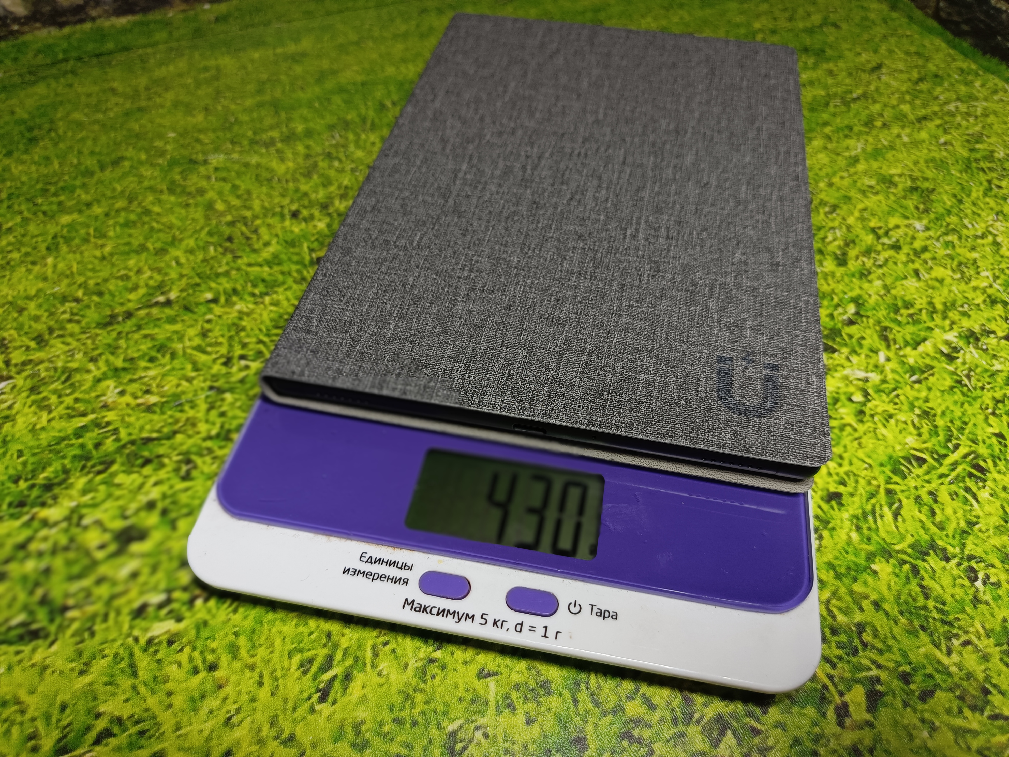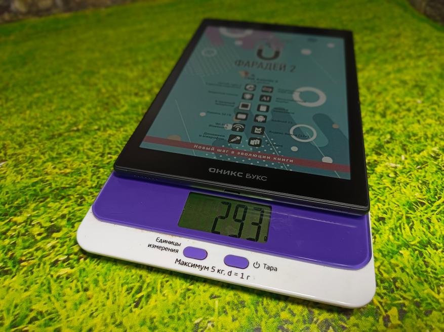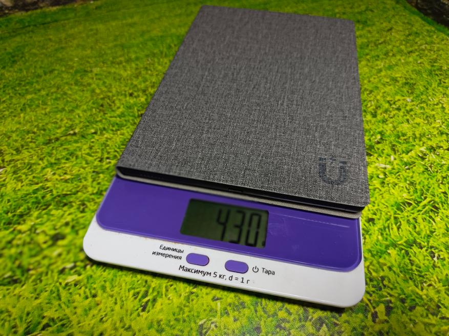 Вес устройства — 293 г, с чехлом — около 430 г. Толщина боковых рамок составляет 7 мм, нижней — 16 мм, а толщина самого корпуса — 8,3 мм, увеличиваясь до 14 мм с надетым чехлом.