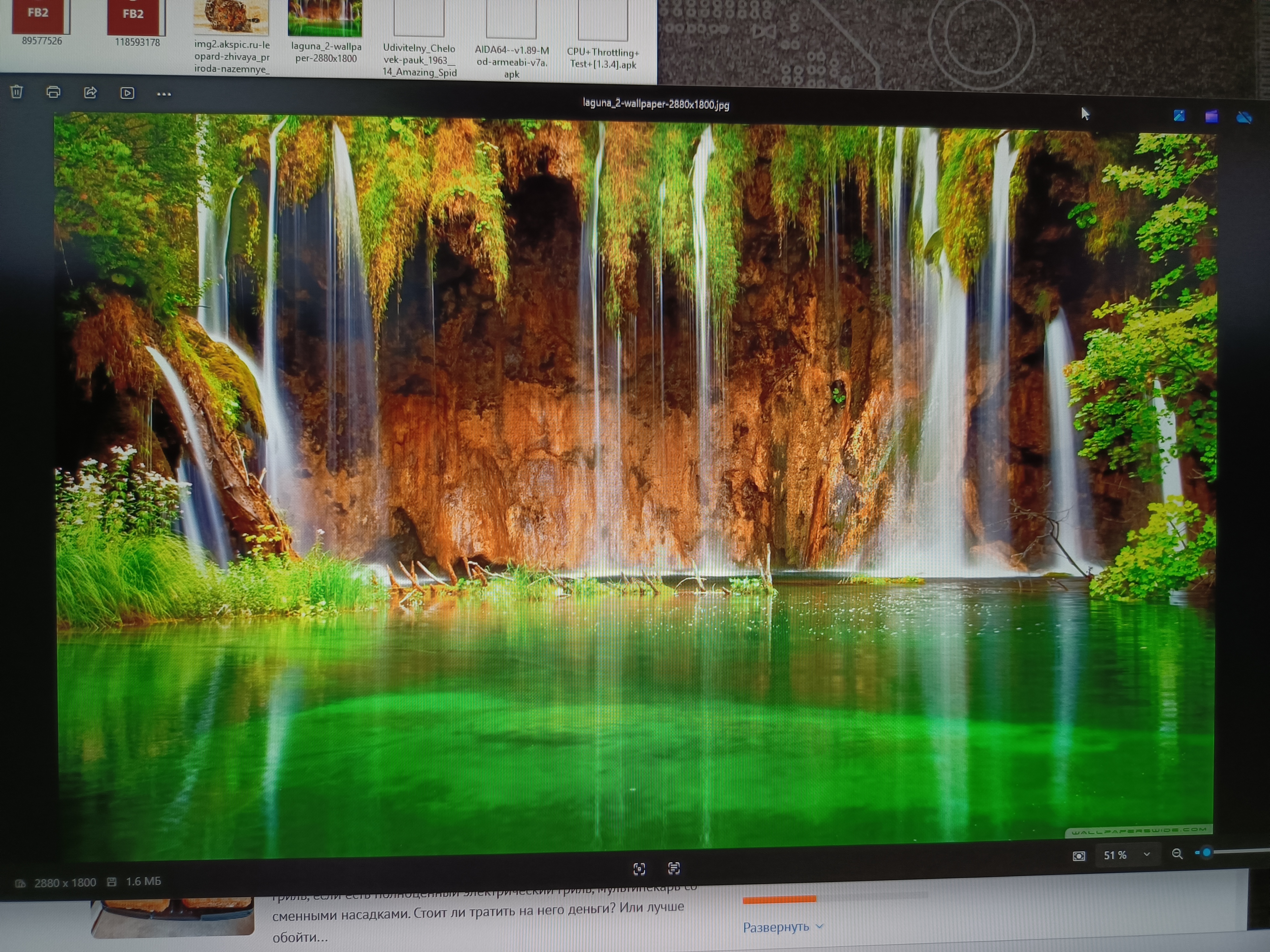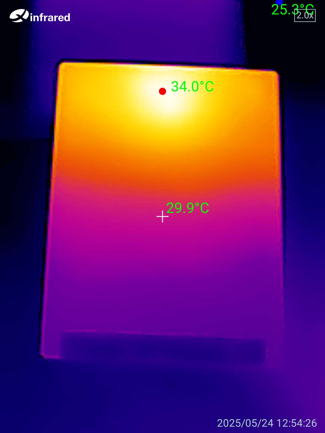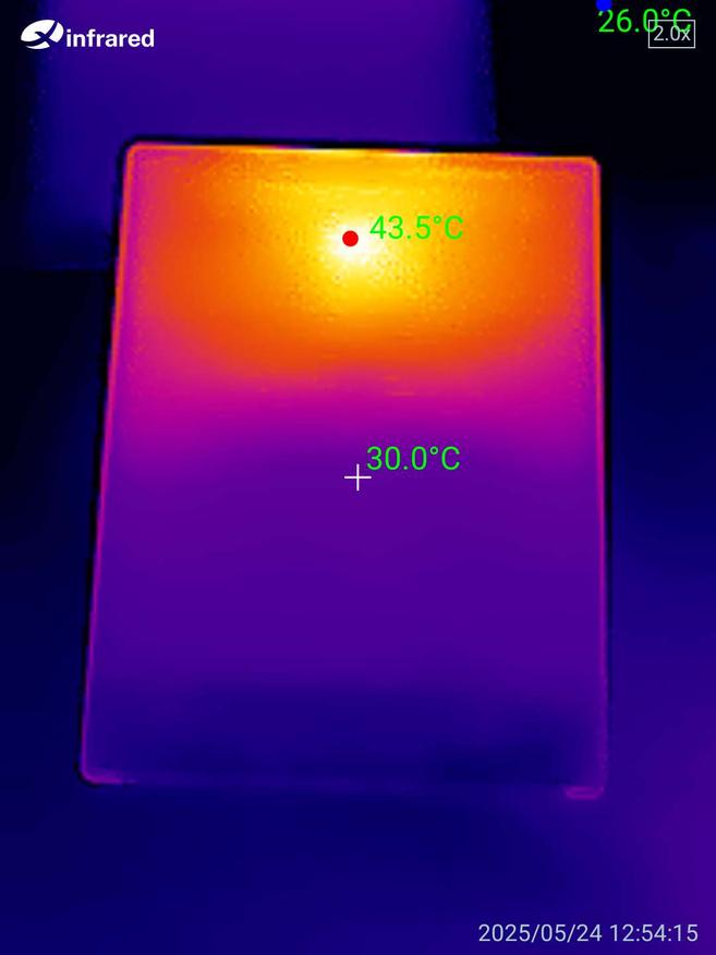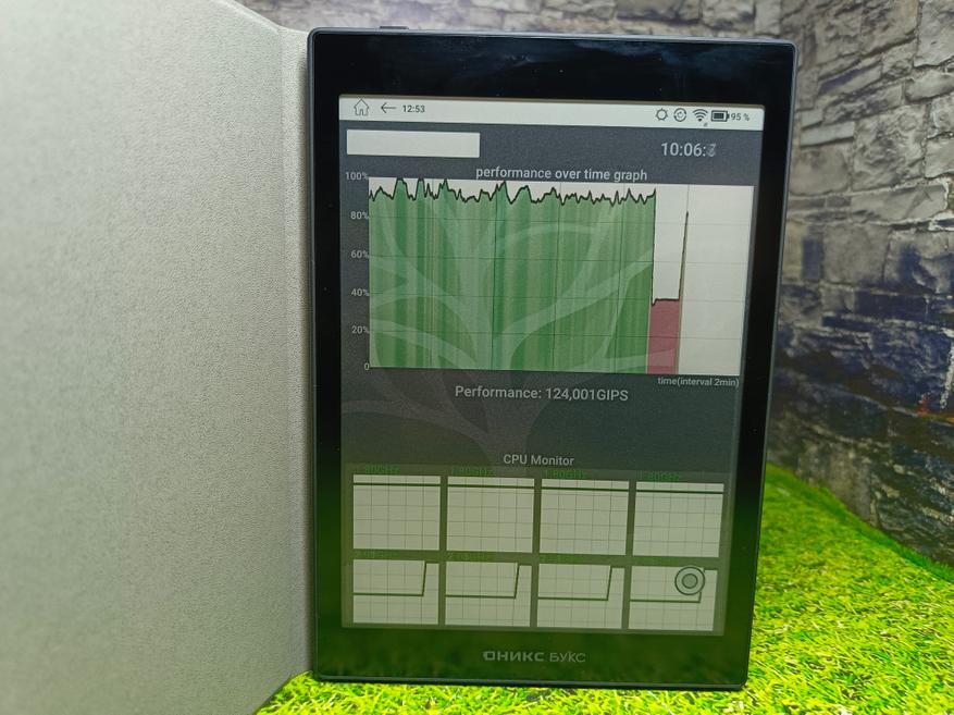 Включив тест на троттлинг процессора на 10 минут, получил температуру корпуса 34 градуса со стороны дисплея и 43,5 с обратной стороны. Видно, что основная плата расположилась в верхней части корпуса, а в нижней — аккумулятор. То есть книжка остается холодной даже при таком тесте, что уж тогда говорить при обычной эксплуатации. В конце теста видно красную полосу, это книжка просто ушла в спящий режим, а так график ровный и держится в пределах 90%, каких-то сильных всплесков нет.