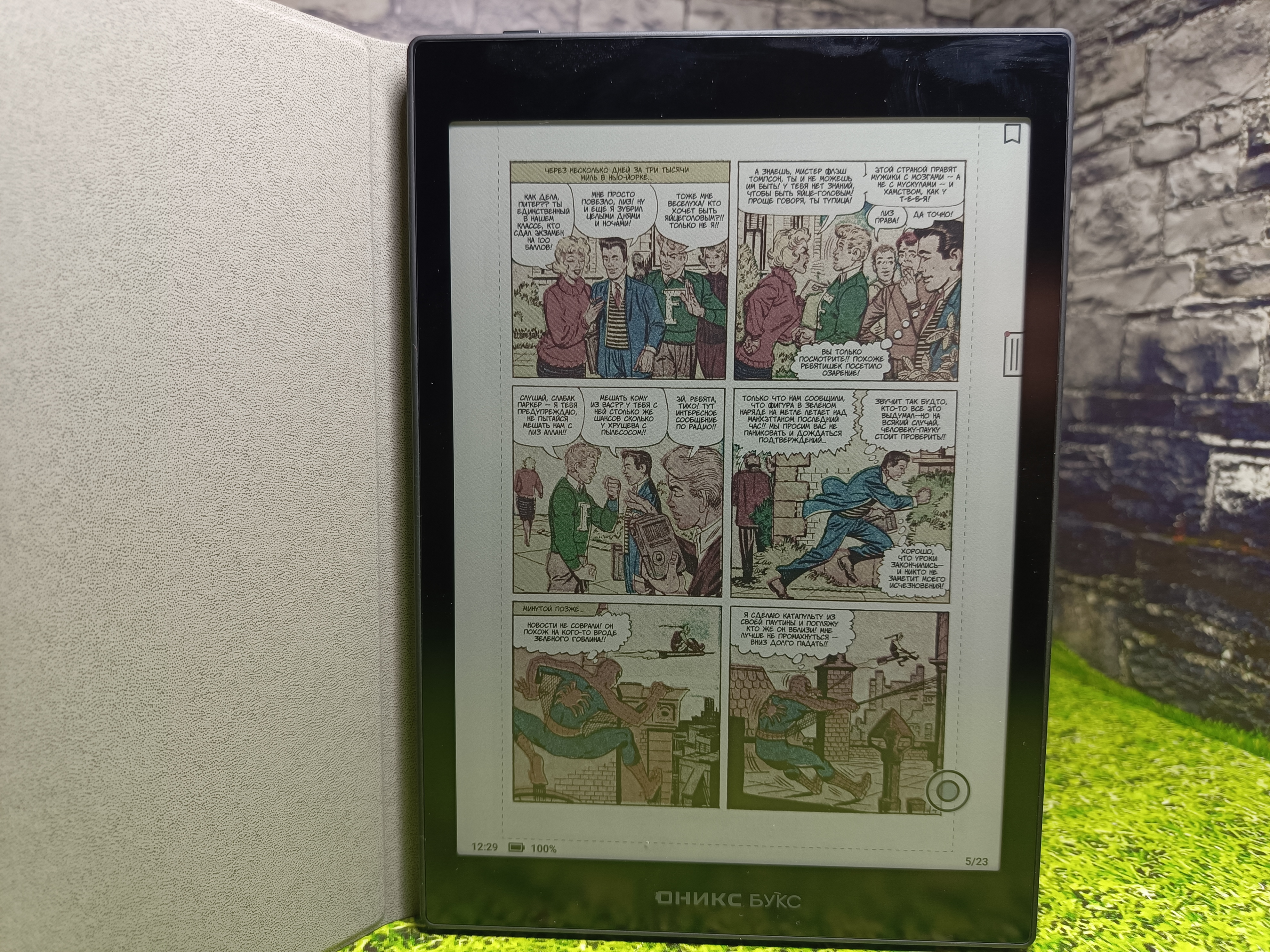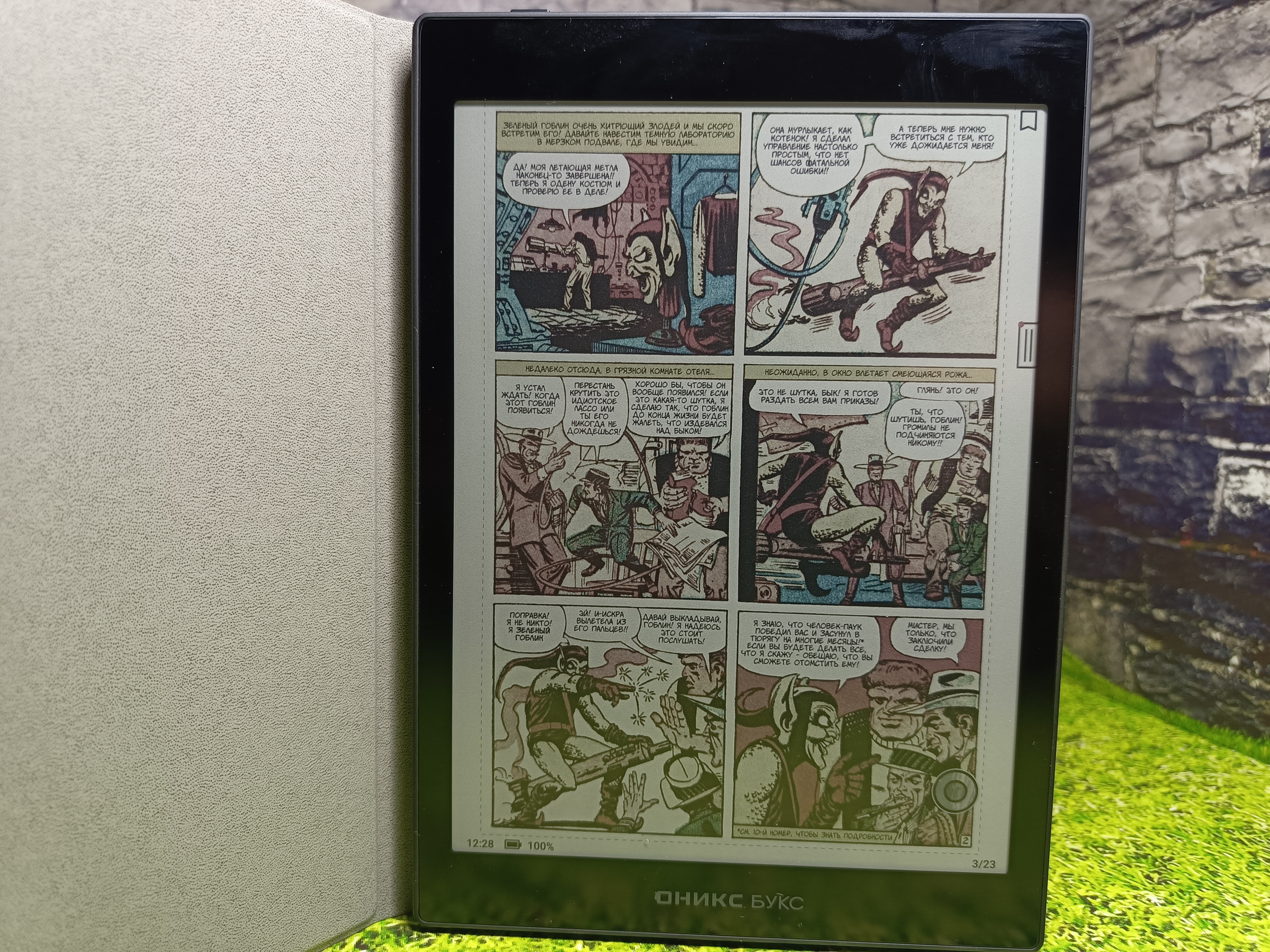 Дисплей E Ink Kaleido 3 поддерживает 4096 цветов и 16 оттенков серого в монохроме. Для тестирования были использованы изображения с ярко выраженными основными цветами (красный, синий, зелёный), отображаемые на экране устройства вполне достойно. Конечно, по насыщенности и цветовой палитре изображение очень сильно уступает классическому IPS-дисплею, но для комиксов и детских иллюстрированных книг — этого более чем достаточно.