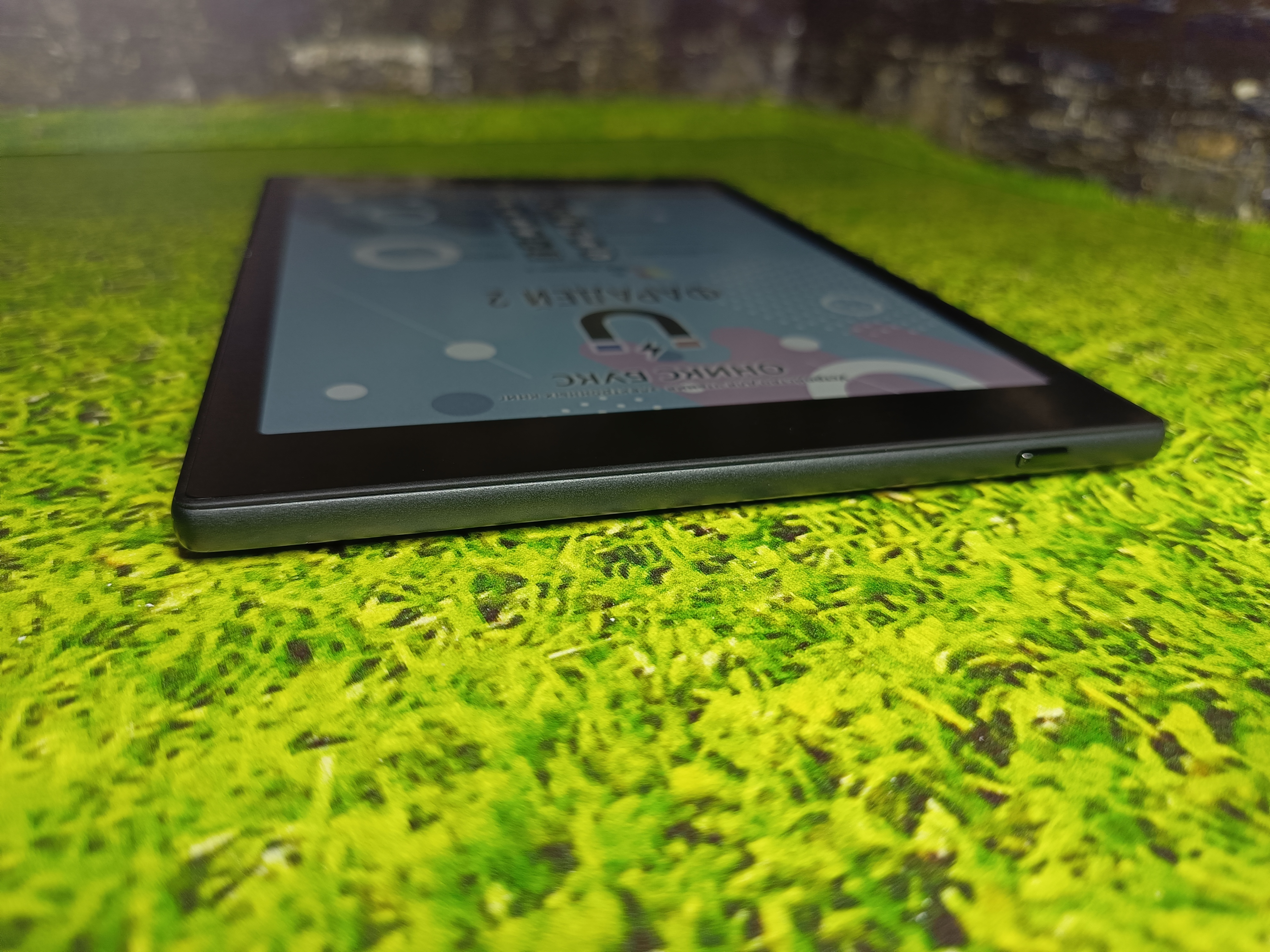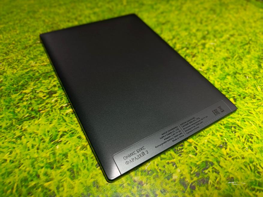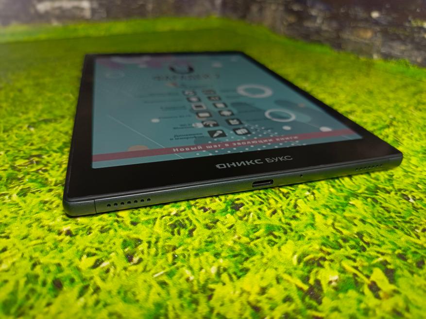 Дизайн устройства выполнен в сдержанных черно-серых тонах. Прямоугольный корпус с мягко закруглёнными краями на задней панели делает книгу удобной в руке. На верхнем торце — механическая кнопка включения, на нижнем — разъём USB Type-C и два встроенных динамика. То есть ничего лишнего на корпусе, но, к сожалению, сбоку отсутствует качелька громкости.