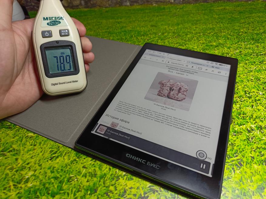 На нижнем торце расположены два динамика, которые обеспечивают чёткий и качественный звук. На максимальной громкости уровень шума составляет около 78 dBA, чего достаточно для прослушивания аудиокниг и музыки. При необходимости звук можно вывести по Bluetooth на внешнюю аудиосистему или наушники. Музыку можно воспроизводить как через встроенный плеер, так и в браузере или любом стороннем приложении.
