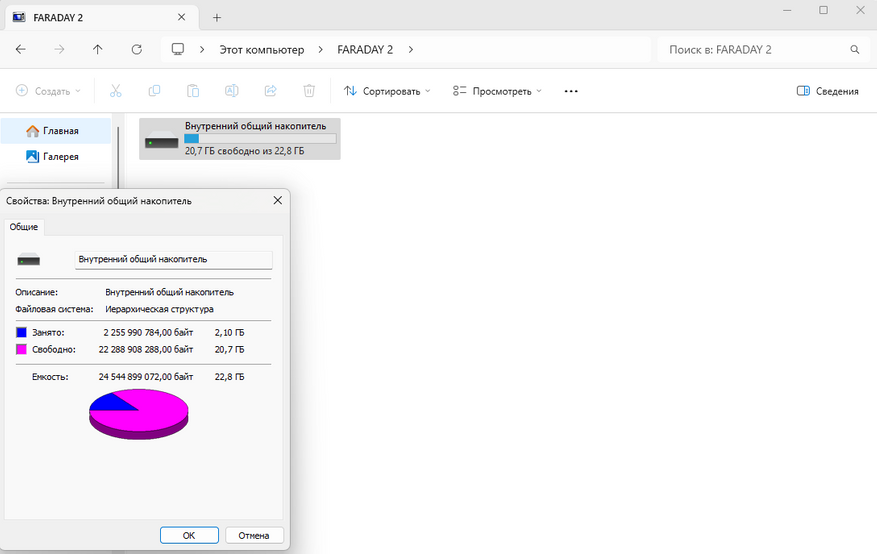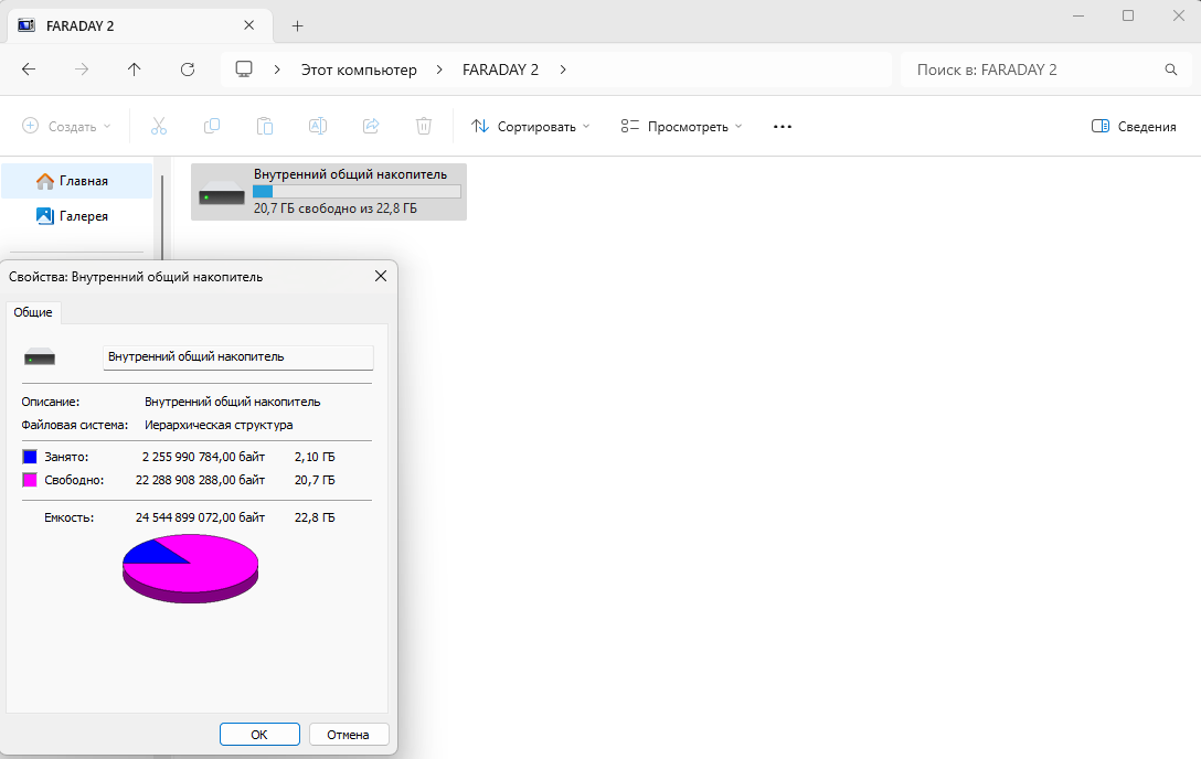При подключении к компьютеру устройство определяется как внешний накопитель со свободным пространством 20,7 ГБ. Для смартфона это немного, но для электронной книги — достаточно. Однако стоит учесть, что в устройстве есть Android, динамики и Bluetooth, что расширяет его возможности для прослушивания музыки, аудиокниг и игр. А этого уже мало.