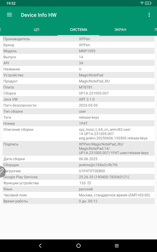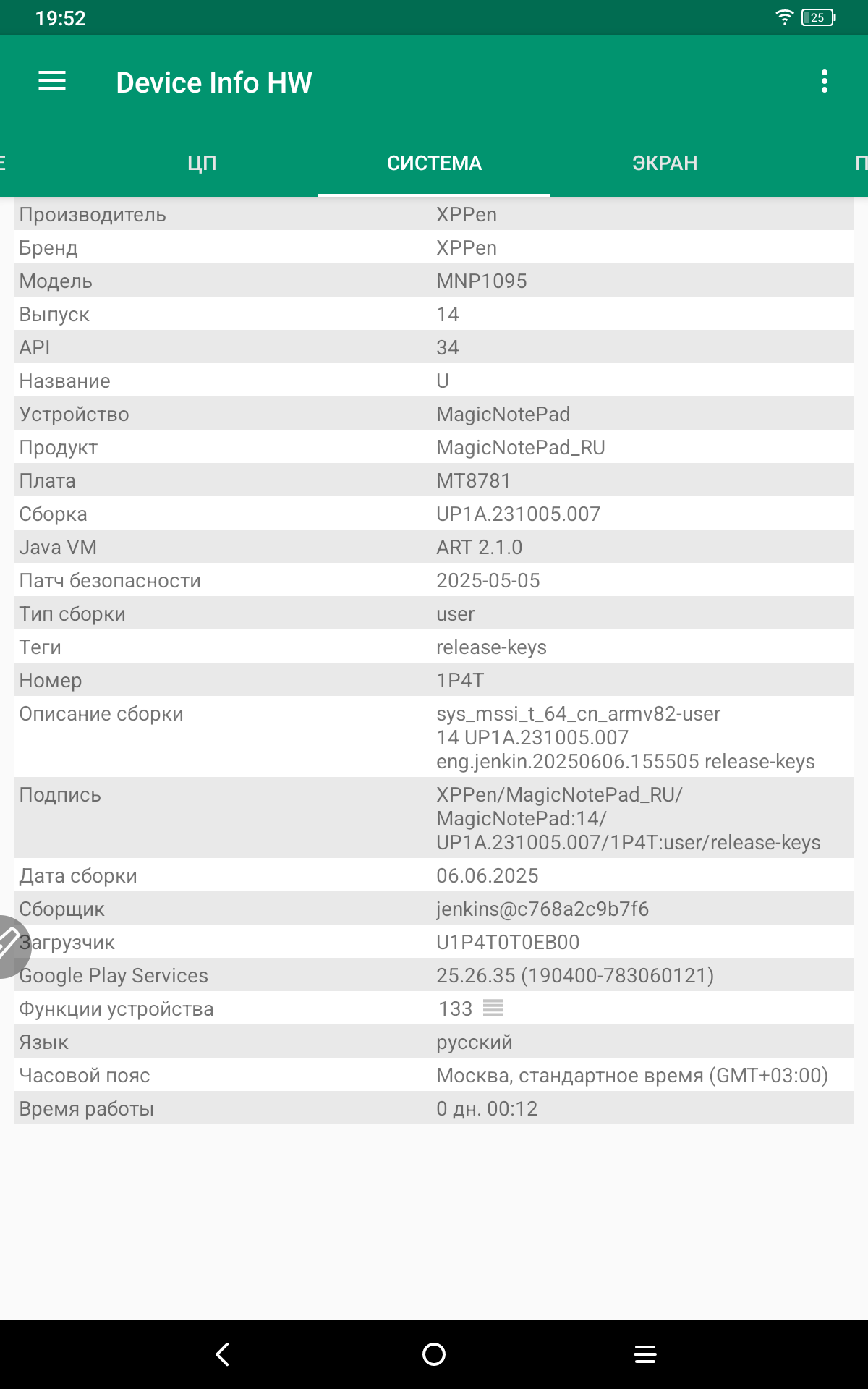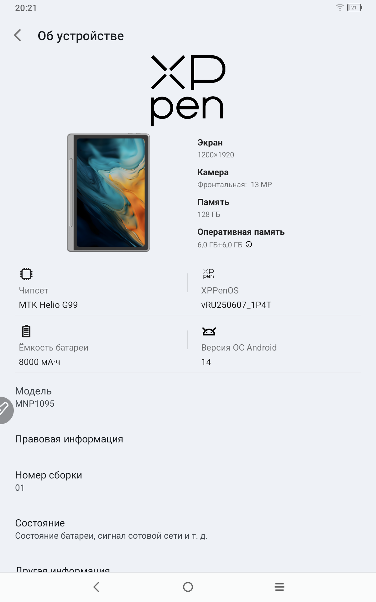 В отличие от большинства графических планшетов, данная модель относится к настоящим смарт-системам. На борту свежий Android 14-версии, 128 ГБ встроенной флеш-памяти. Есть стандартные «фишки», типа трансляции экрана (будет удобно для презентаций результатов творчества), разделения экрана и подобных. На мой взгляд, не помешал бы слот для карты памяти, но при нехватке места можно использовать облачные сервисы. Зарядка относительно быстрая (20 Вт).