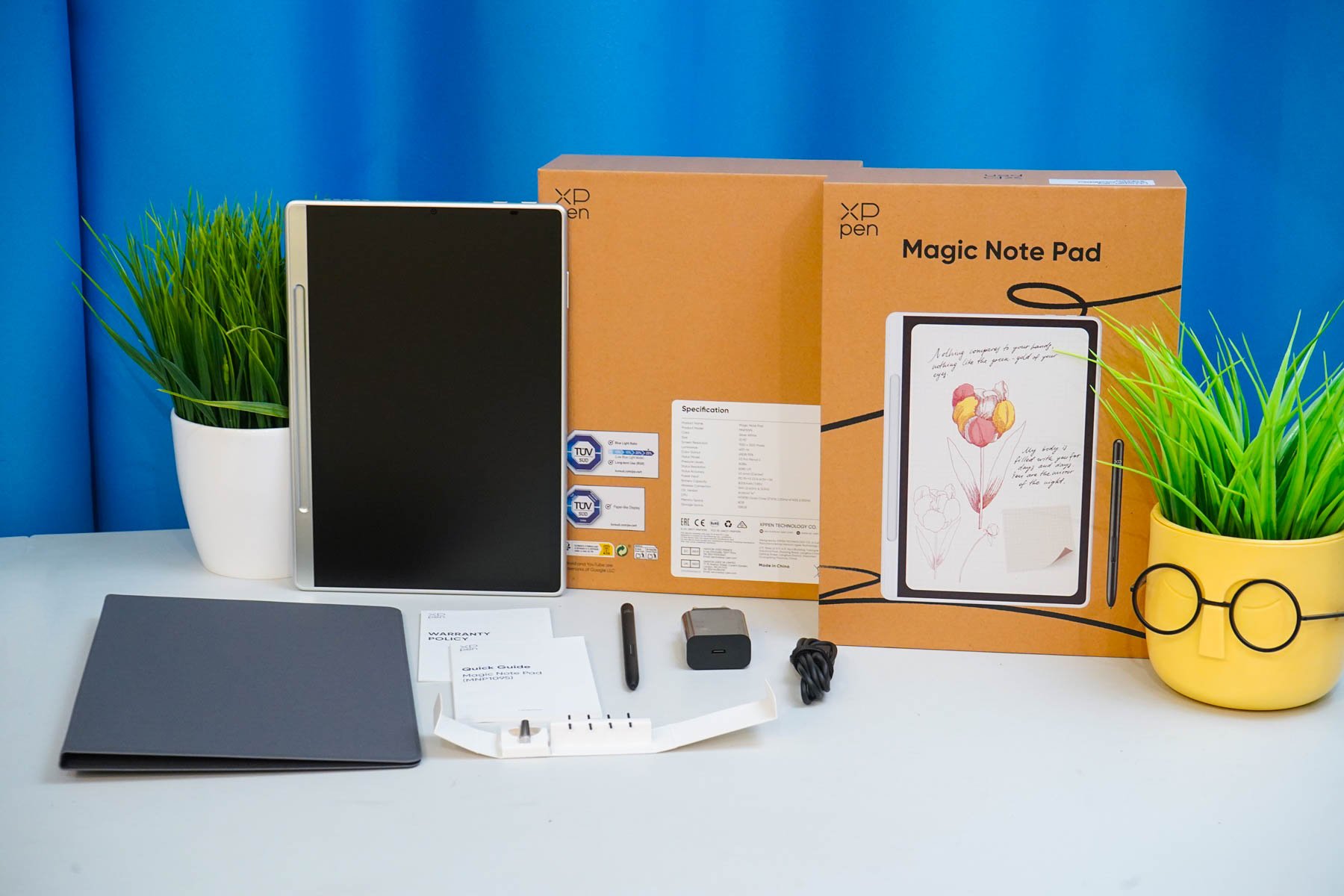 Наконец-то появились полноценные графические планшеты, позволяющие рисовать и ретушировать автономно, без дополнительно подключенного ноутбука/компьютера или другого планшета/смартфона. Речь идет про новый XPPen Magic Note Pad. Данное устройство сложно назвать полноценным планшетом, но это скорее цифровой блокнот с расширенными возможностями. В коробке имеется ручка-стилус с набором запасных наконечников, а также источник питания и кабель. Конечно, есть и подробное руководство по эксплуатации.
