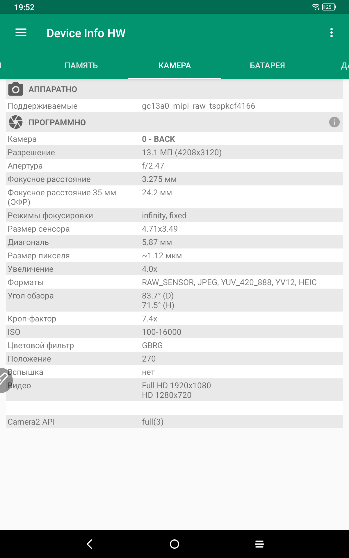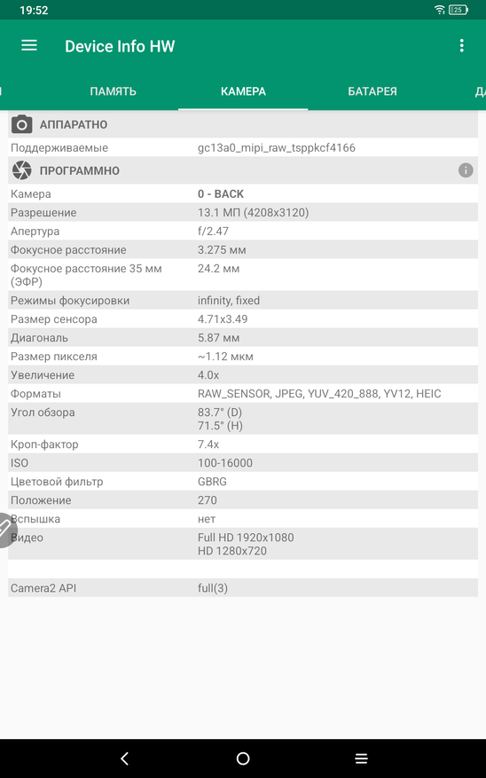 Некоторую информацию можно получить из Device Info HW, есть указание сенсора камеры, типа и объема памяти, размера батареи и прочие спецификации.