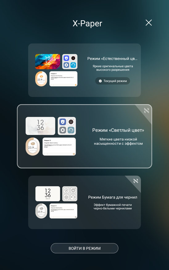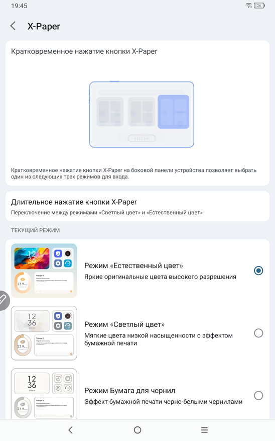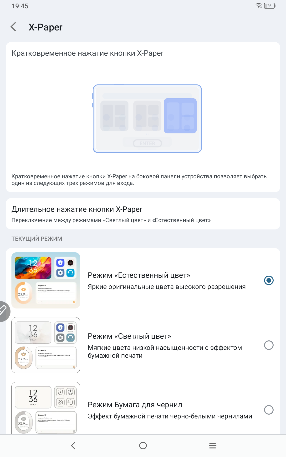 Оценил и графические режимы. В режиме «бумаги» получается буквально читалка-букридер — используется контрастный монохромный режим, имитирующий бумагу. Этот режим подходит для чтения (в том числе предусмотрен фильтр синего для тех, кто проводит много времени за планшетом).