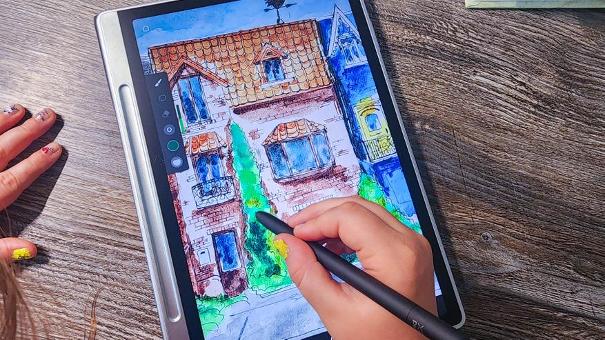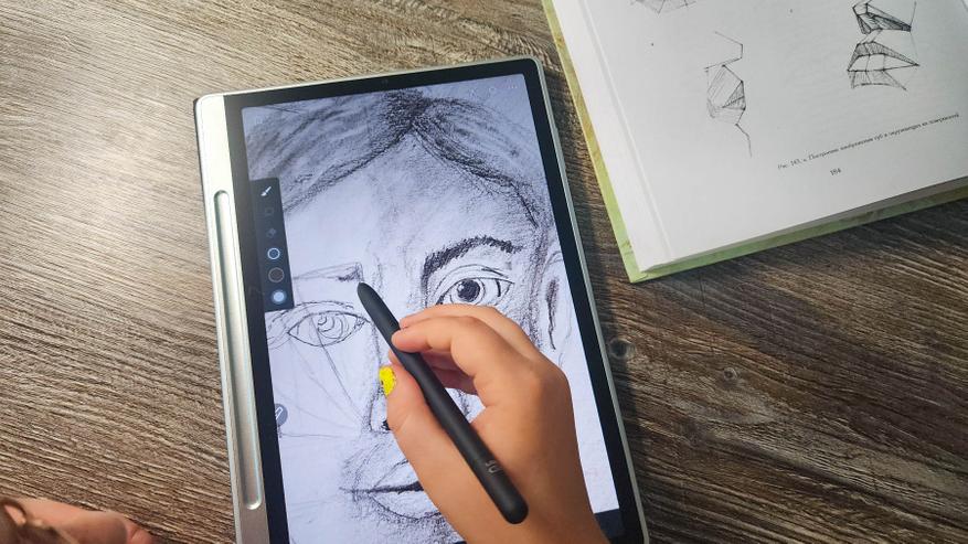 Интерес к подобным графическим планшетам в последнее время вырос — такие устройства востребованы не только среди профессионалов, но и среди начинающих художников, студентов художественных школ и просто энтузиастов. В частности, я использую для обучения ребенка, так как неплохой экран, высокая частота обновления и матовое покрытие дисплея позволяют спокойно рисовать скетчи/наброски и заниматься ретушью/дизайном. Отмечу простое управление — пальцами по сенсорному экрану, и стилусом. В данном случае используется современные стилус XP Pro Pencil 2-го поколения (без батареи, EMR-технология), разрешающая способность которого более 16 тысяч уровней нажатия (5080 LPI). Сенсорный экран умеет понимать жесты, например, можно не отвлекаясь на панель инструментов провести масштабирование и прокрутку холста. Также отмечу настраиваемую плавающую кнопку, а также тот момент, что планшет не требует подключения к ПК — работает автономно.