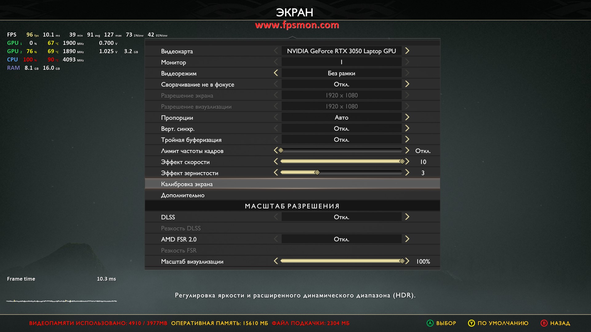 Настройки следующие: FHD разрешение, текстуры высокие, DLSS отключен.
