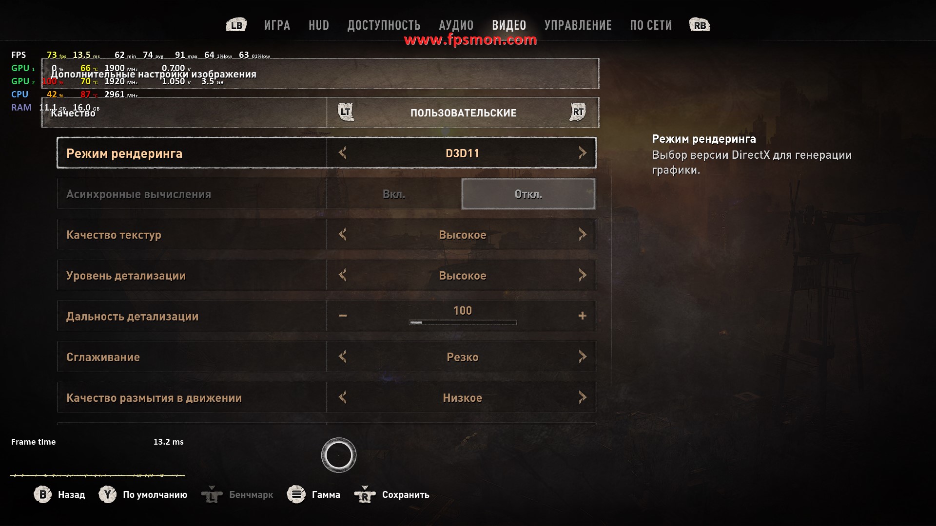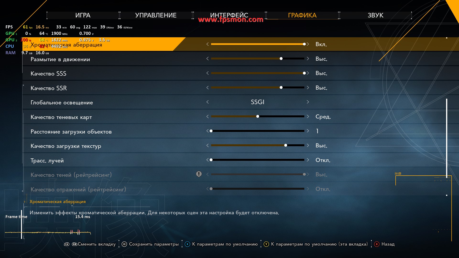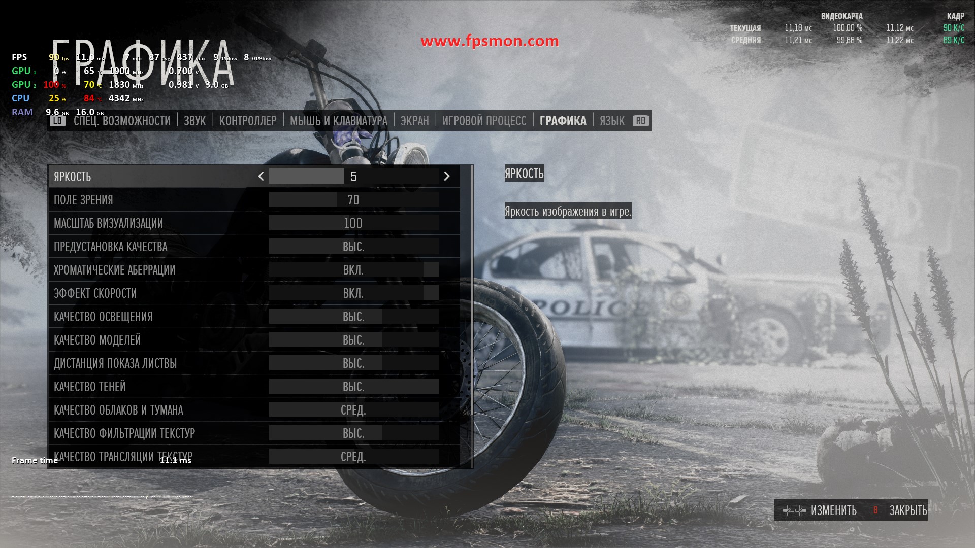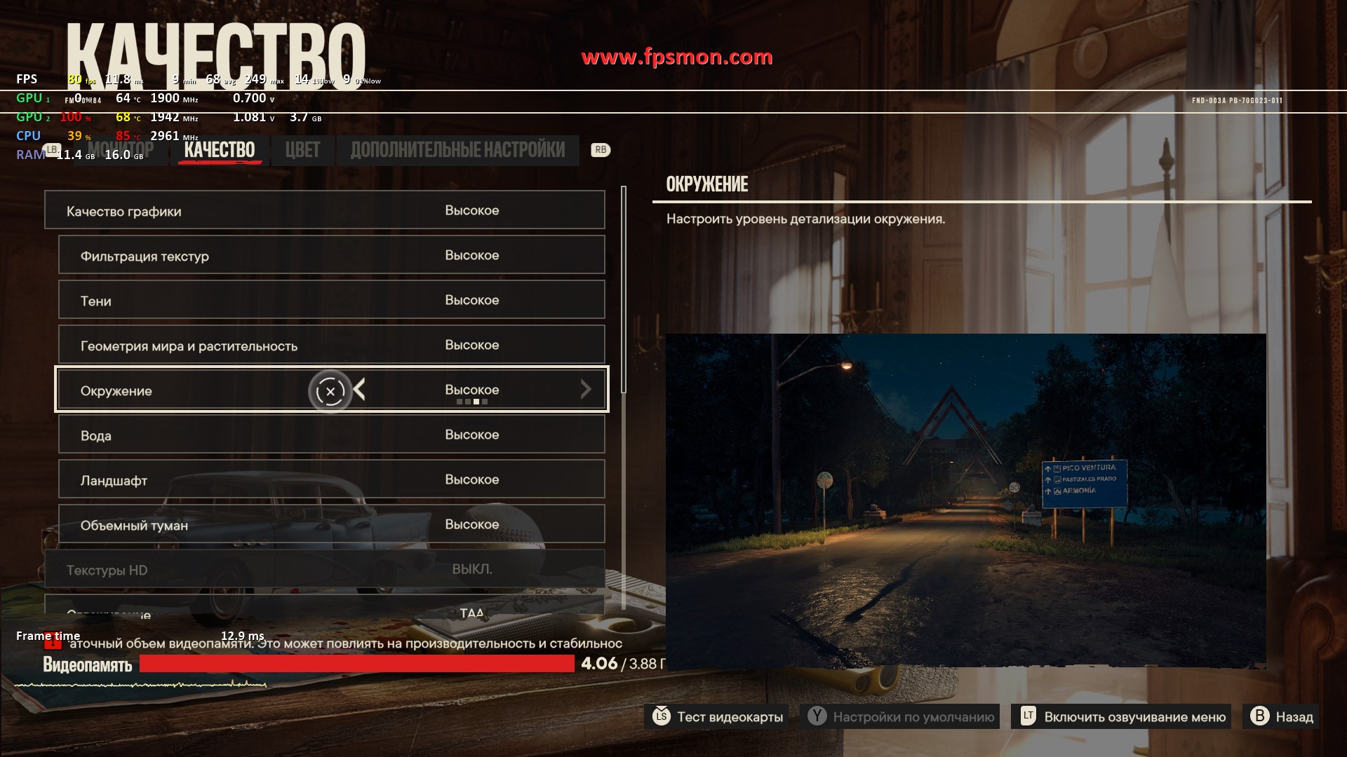 Особенно радует поведение системы в динамичных моментах — даже массовые перестрелки с взрывами не опускают FPS ниже 50. Запас оперативной памяти в 16 ГБ позволяет игре комфортно себя чувствовать, не выходя за 11.2 ГБ потребления.