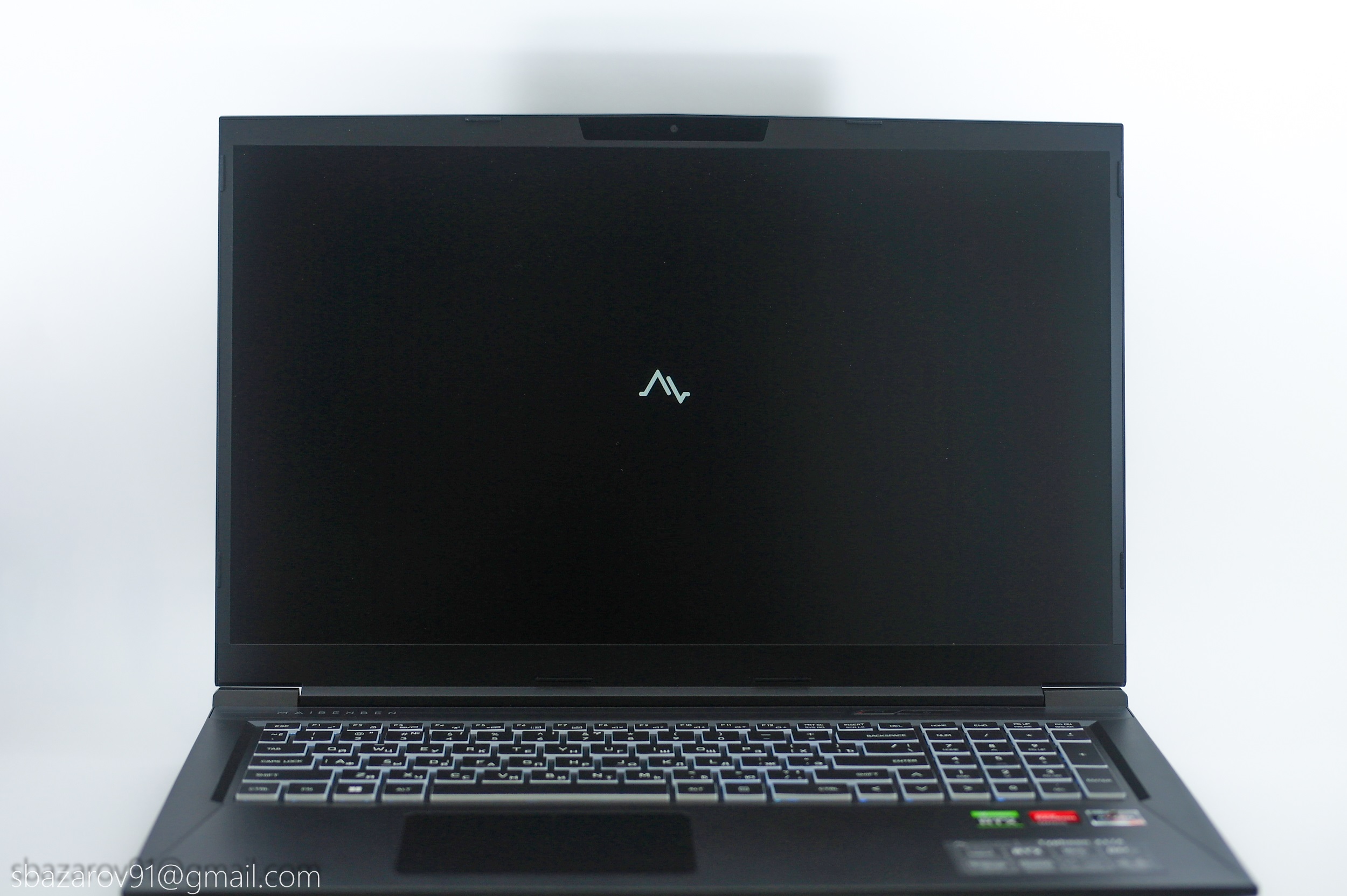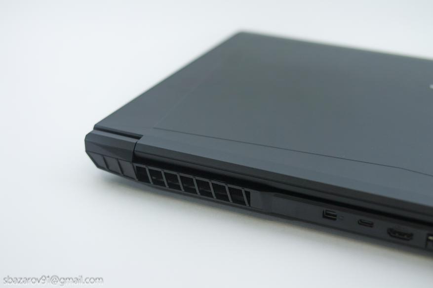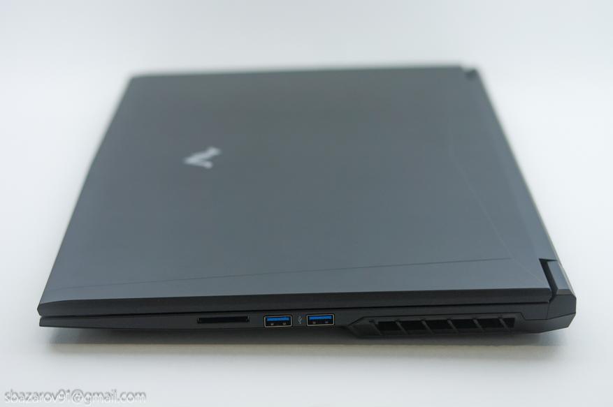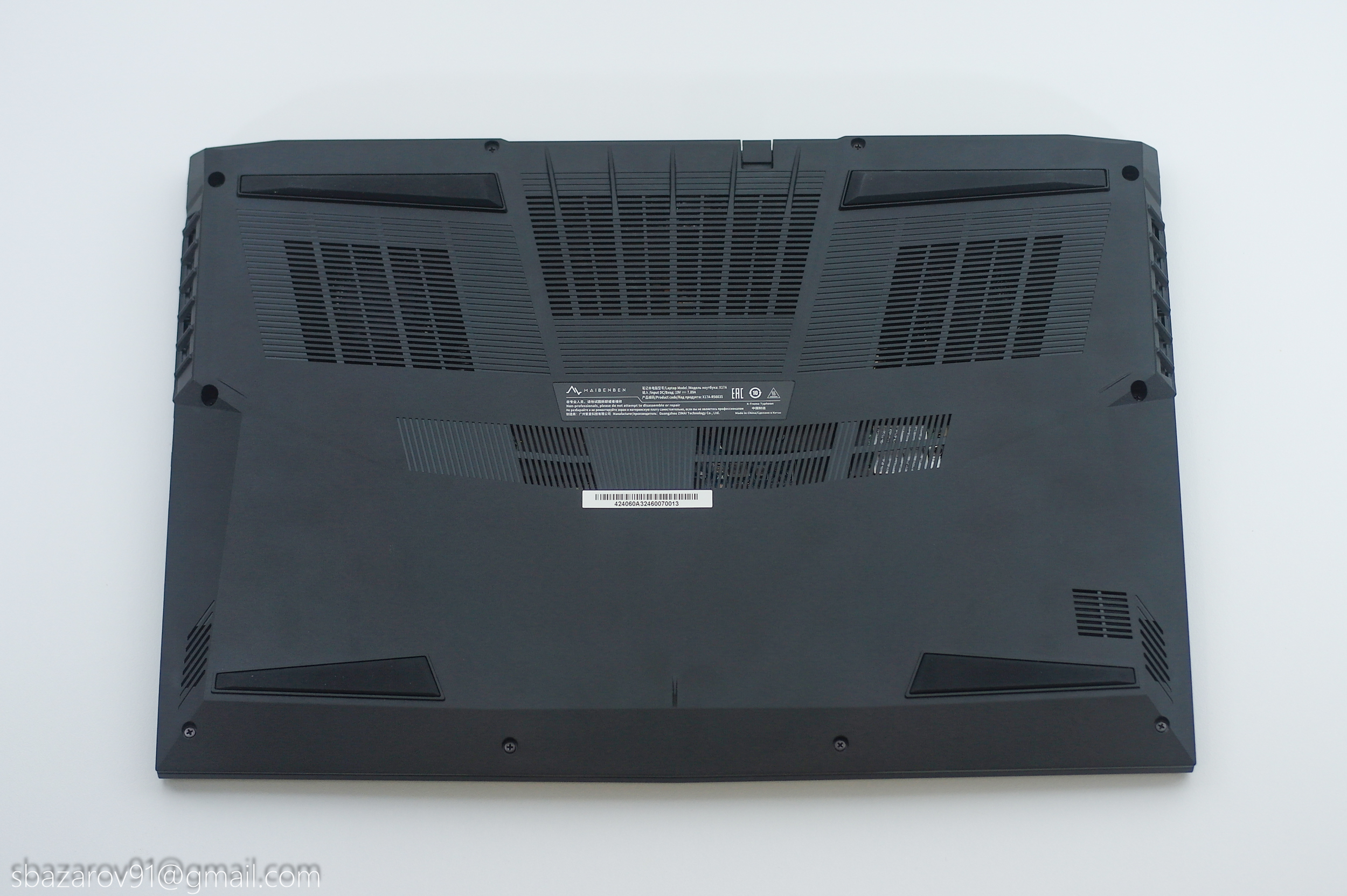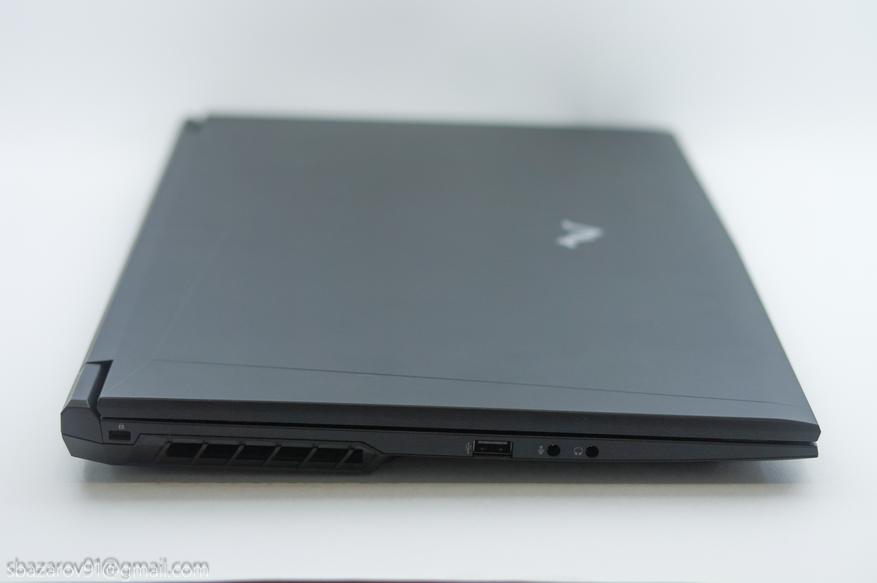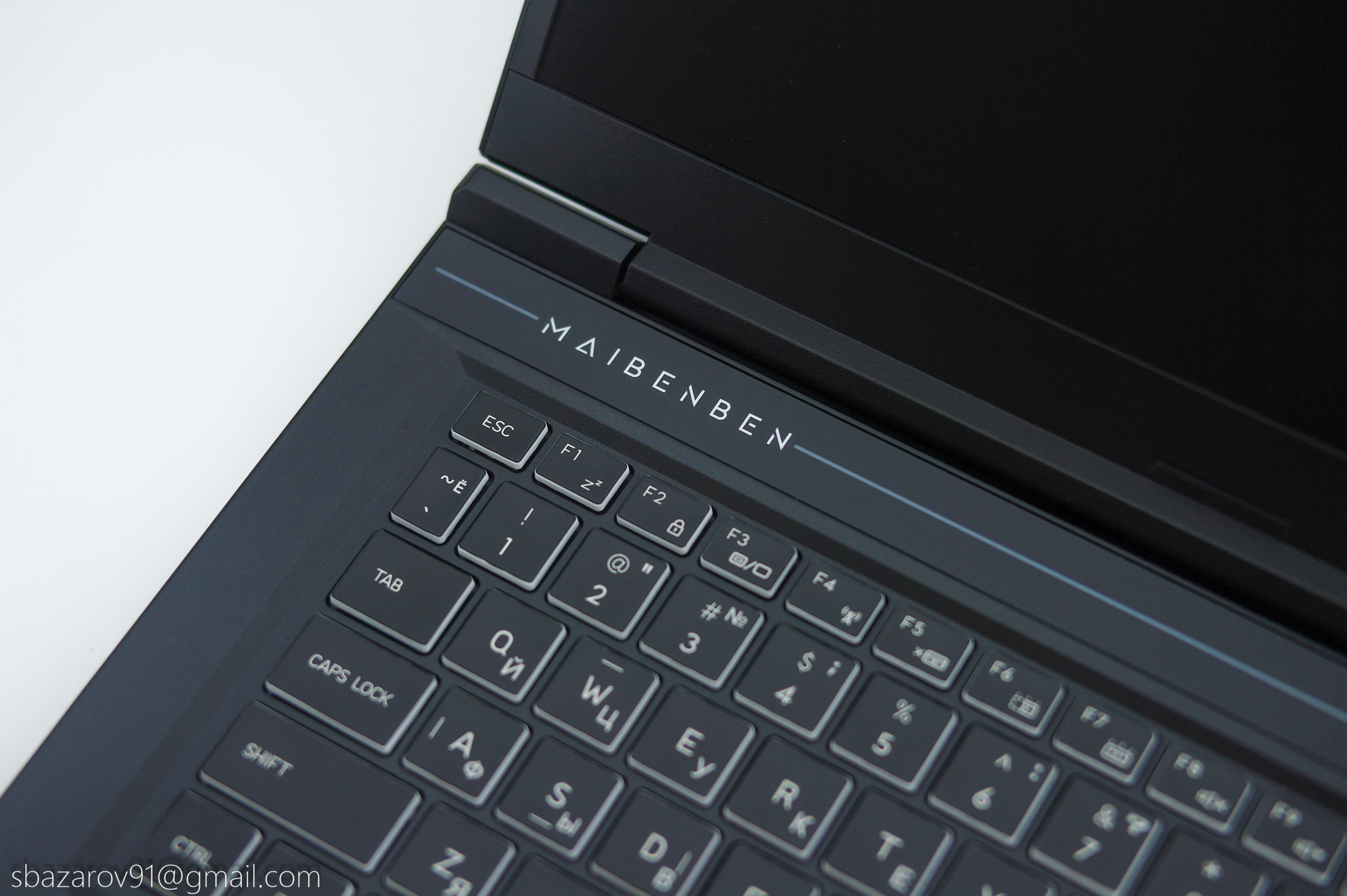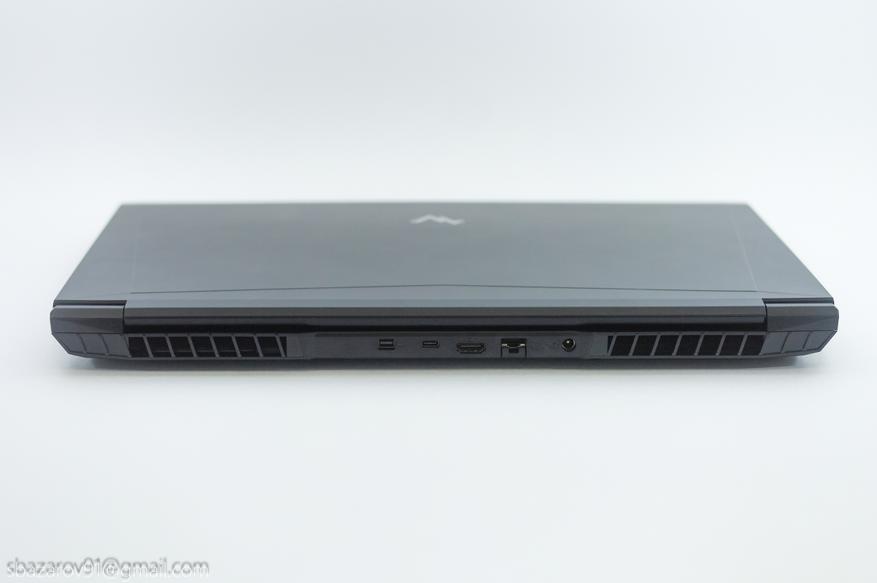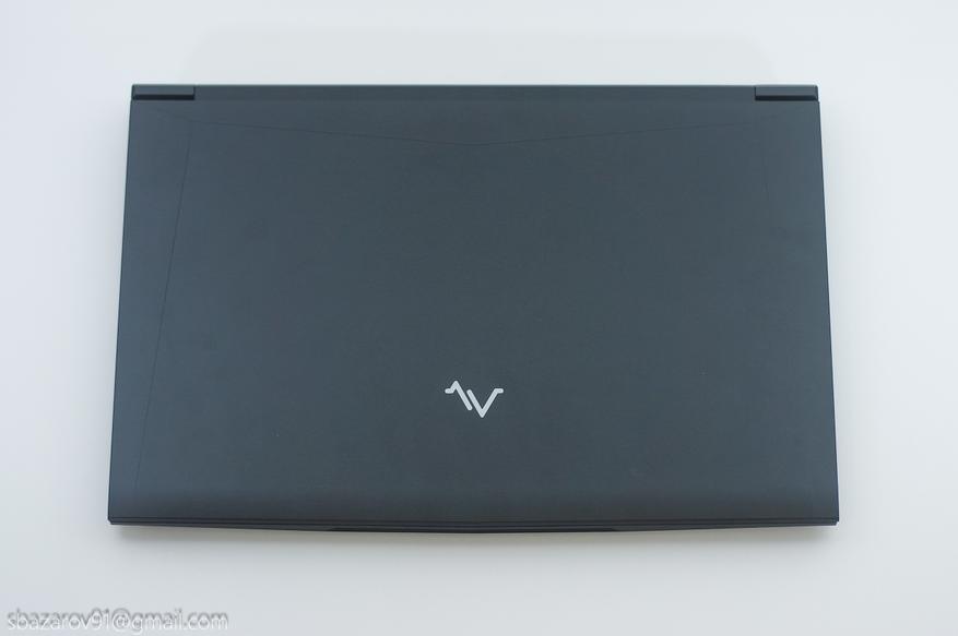 Своими формами и линиями дизайн ноутбука отсылает к линейкам Alienware от Dell и TUF от ASUS. Корпус выполнен из матового чёрного пластика, который, к сожалению, любит собирать отпечатки пальцев. Верхняя крышка практически пустая — только логотип Maibenben, тогда как на задней панели расположены многочисленные вентиляционные решётки для охлаждения компонентов и техническая информация.