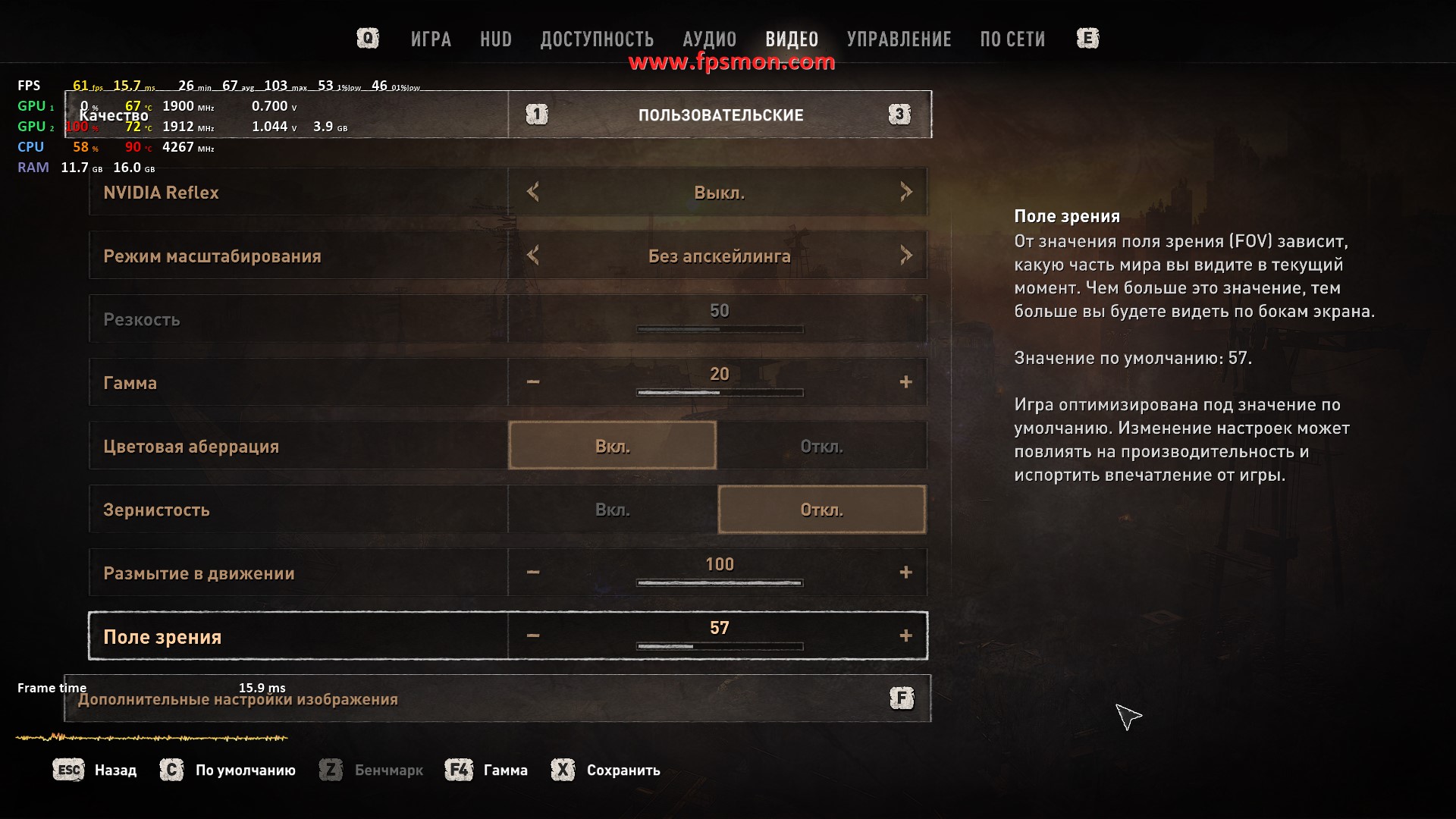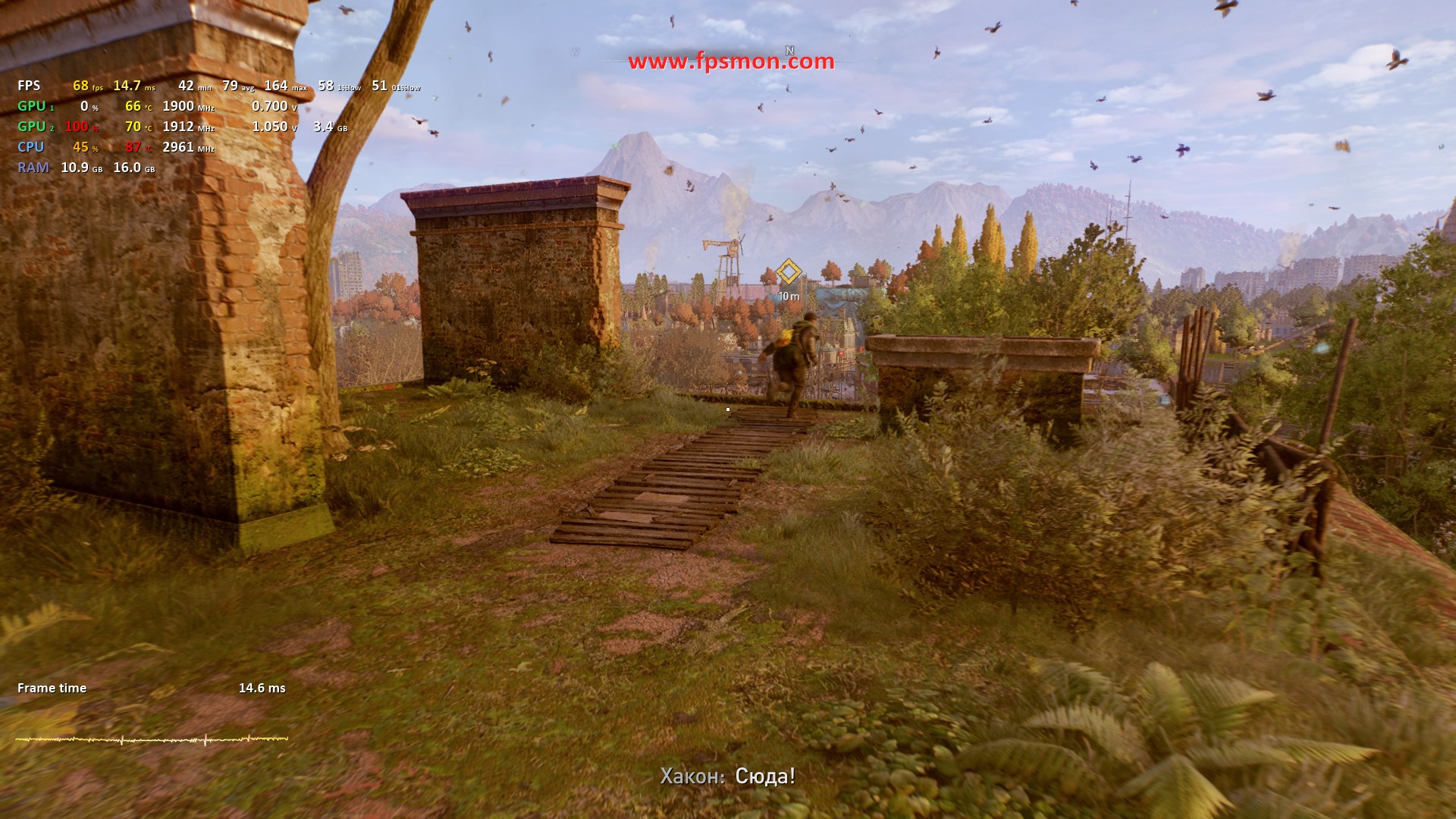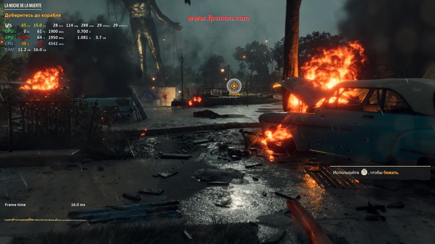 Паркур по мрачным улицам Харана дается тестовой системе вполне уверенно — средний показатель в 56-68 FPS выглядит достойно для этой все еще требовательной игры 2022 года. Плавный геймплей остается даже в самых напряженных сценах с ордами зараженных.