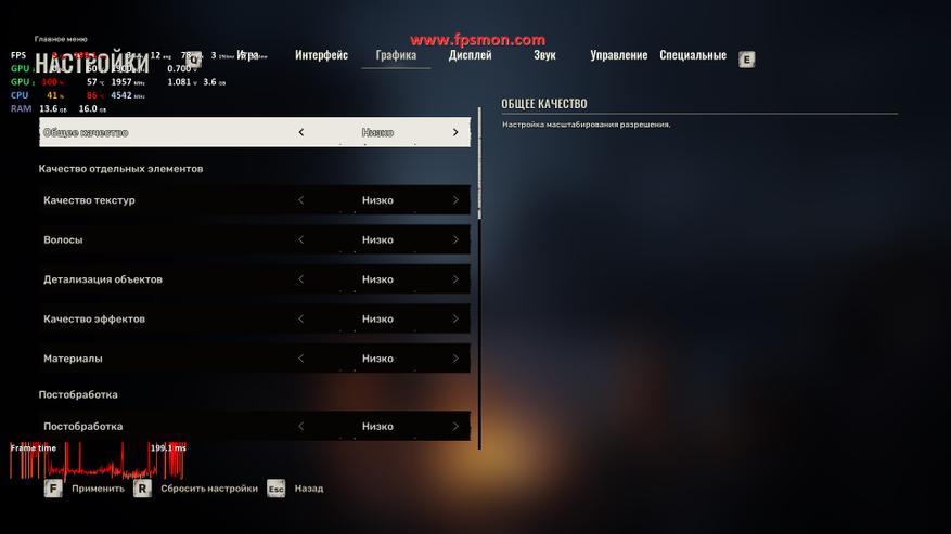Настройки графики: FHD разрешение, текстуры низкие.
