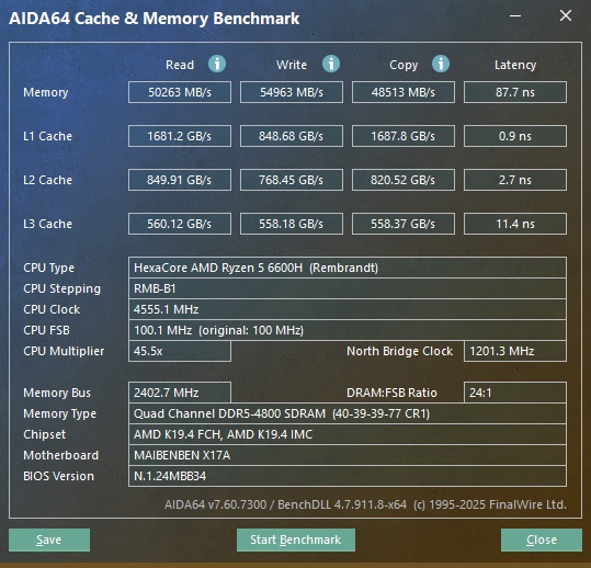 Кэш первого уровня демонстрирует скорость 1,68 ТБ/с при задержке менее 1 наносекунды. Кэши второго и третьего уровней работают на скоростях 800-560 ГБ/с, создавая оптимальные условия для процессора AMD Ryzen 5 6600H. Таким образом, Ryzen 5 6600H выдает близкие результаты к десктопному процессору Ryzen 5 5600, способный на многое даже в 2025 году.