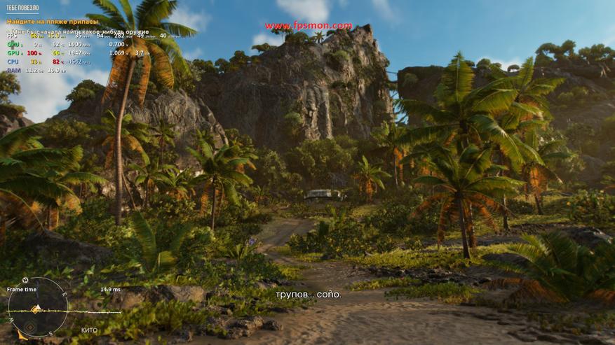 Пока герой пробирается к кораблю через джунгли Яры, железо Maibenben X17A демонстрирует вполне боеспособные результаты. Средний FPS держится в районе 65 кадров, что для тропических пейзажей Far Cry 6 — достойный показатель. Видеокарта работает на полную мощность, достигая 100% загрузки при комфортных 64°C. Процессор при этом задействован лишь наполовину, подтверждая грамотное распределение нагрузки в этом проекте.