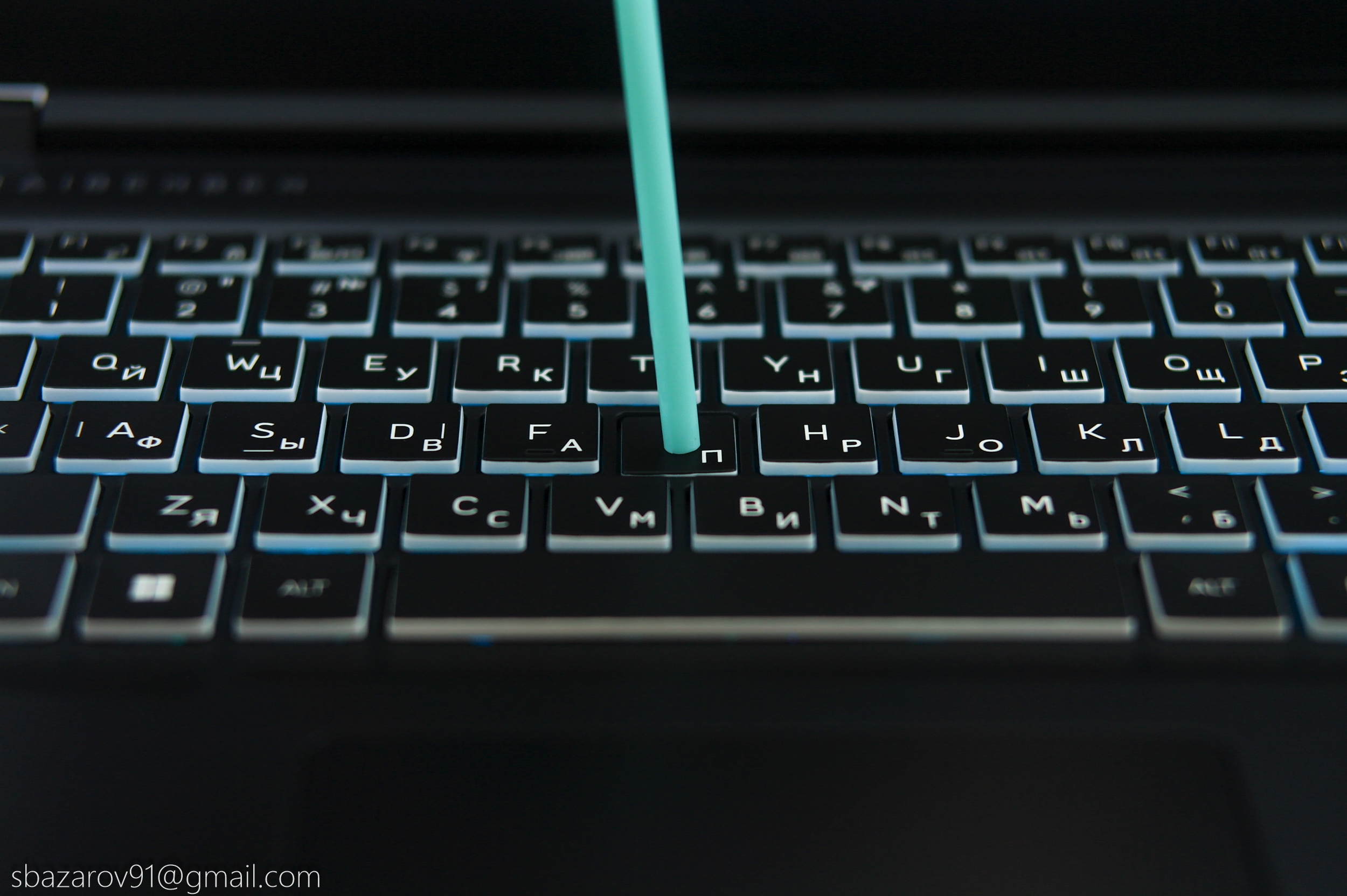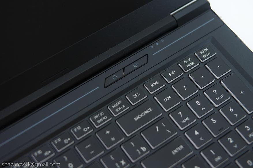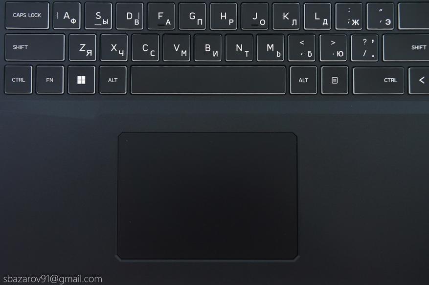 Под клавиатурой расположен матовый тачпад, смещённый влево от центра. Такое расположение может вызывать случайные касания при игре на клавишах WASD — проблему решает отключение тачпада комбинацией Fn+F5.