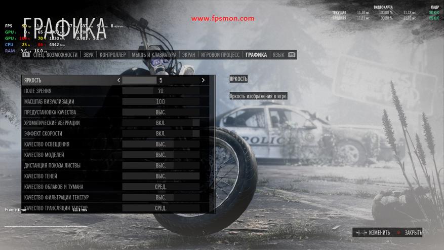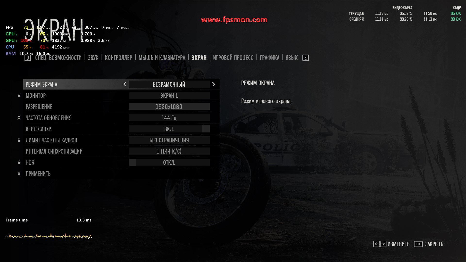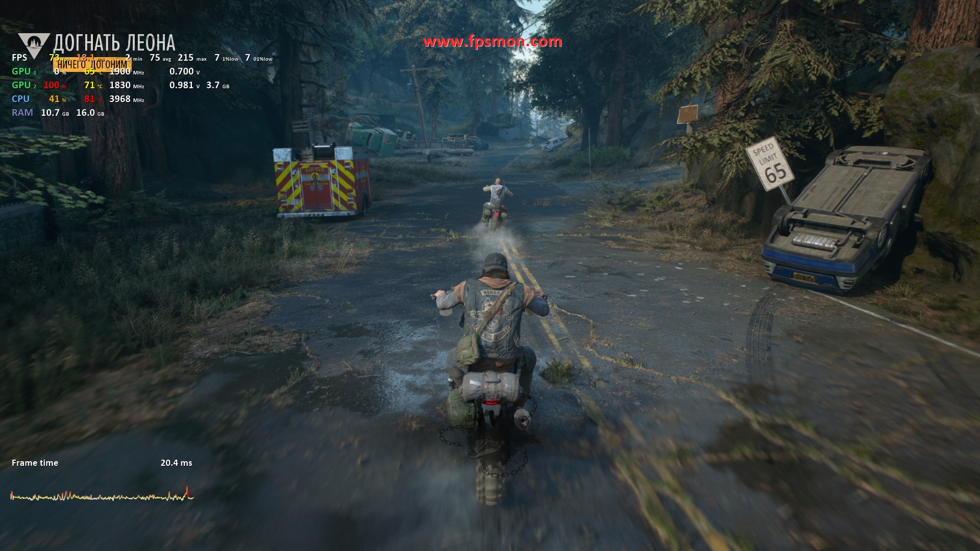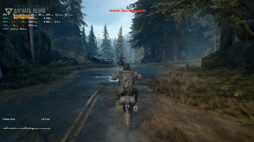 Запуск Days Gone демонстрирует средний показатель в 71 FPS, что выглядит вполне достойно для этого насыщенного открытого мира. Особенно радует стабильность — задержка держится в комфортных пределах 13.5-20.4 мс, что гарантирует плавный геймплей без раздражающих фризов.