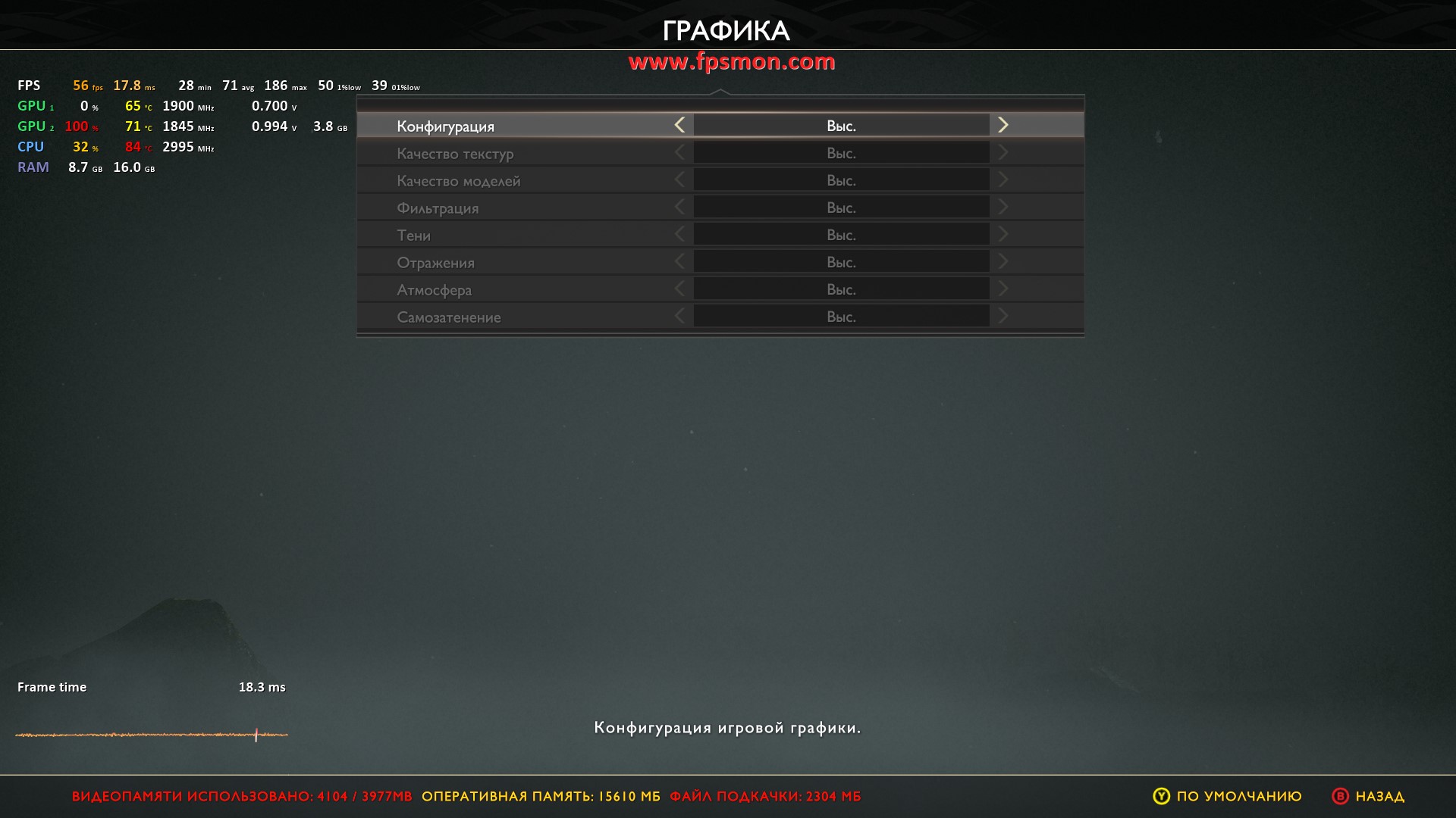 Настройки следующие: FHD разрешение, высокие текстуры, параметры системы максимальные.