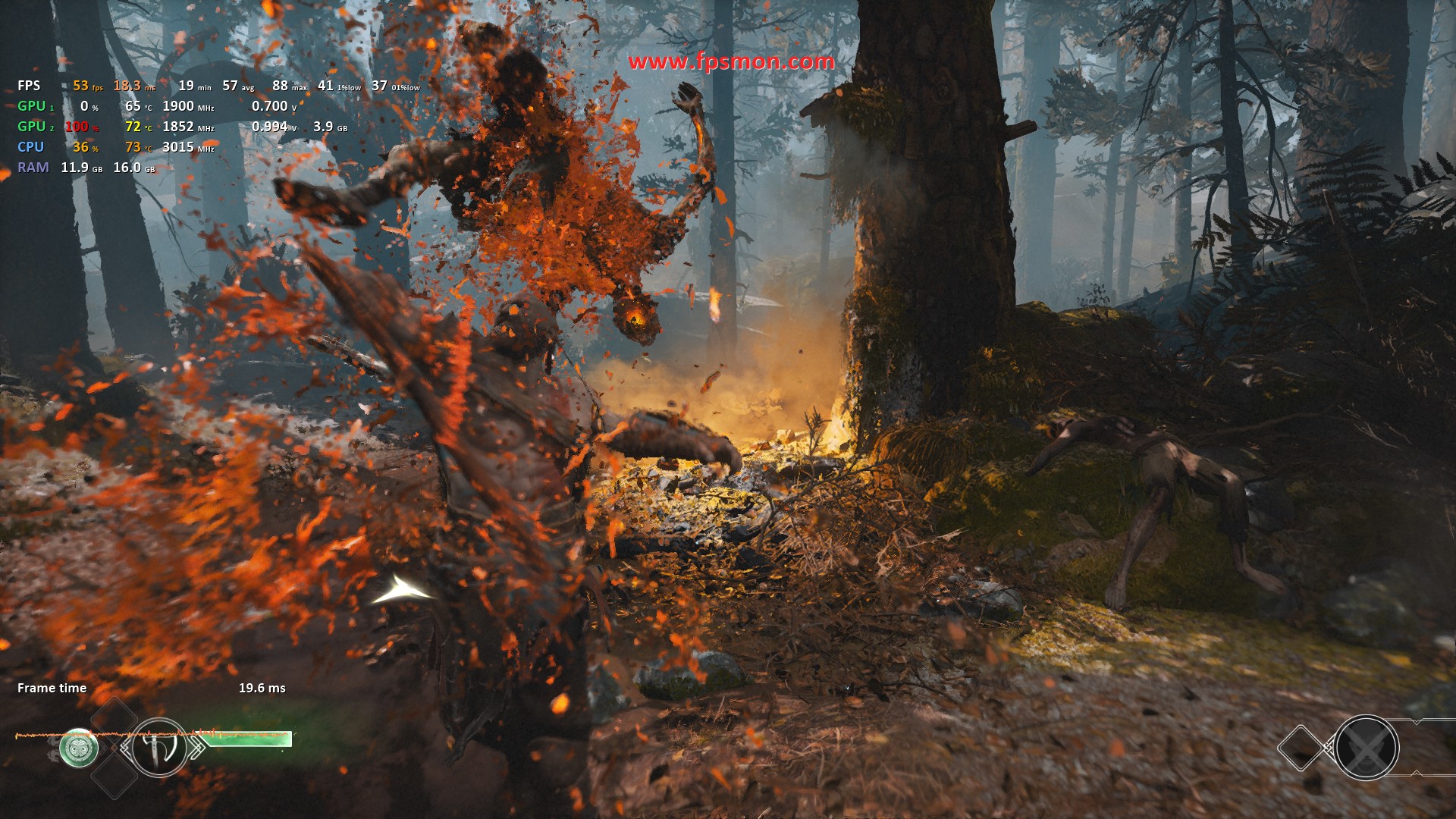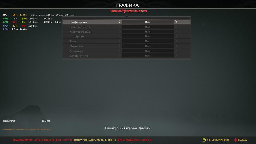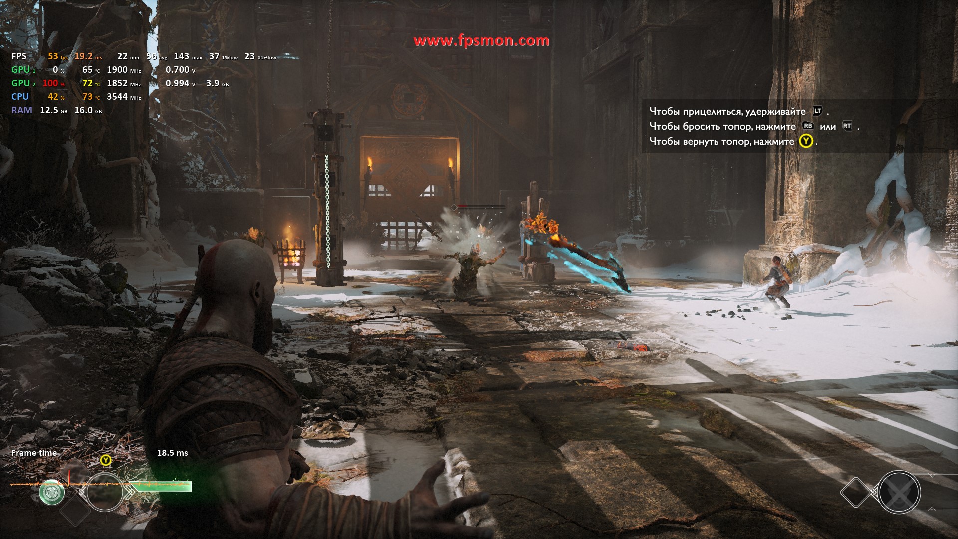 Путешествие по миру скандинавских легенд даётся тестовой системе с переменным успехом — средний FPS колеблется между 53 и 59 кадрами в самых ожесточенных сценах, что выглядит вполне достойно для видеокарты начального уровня.