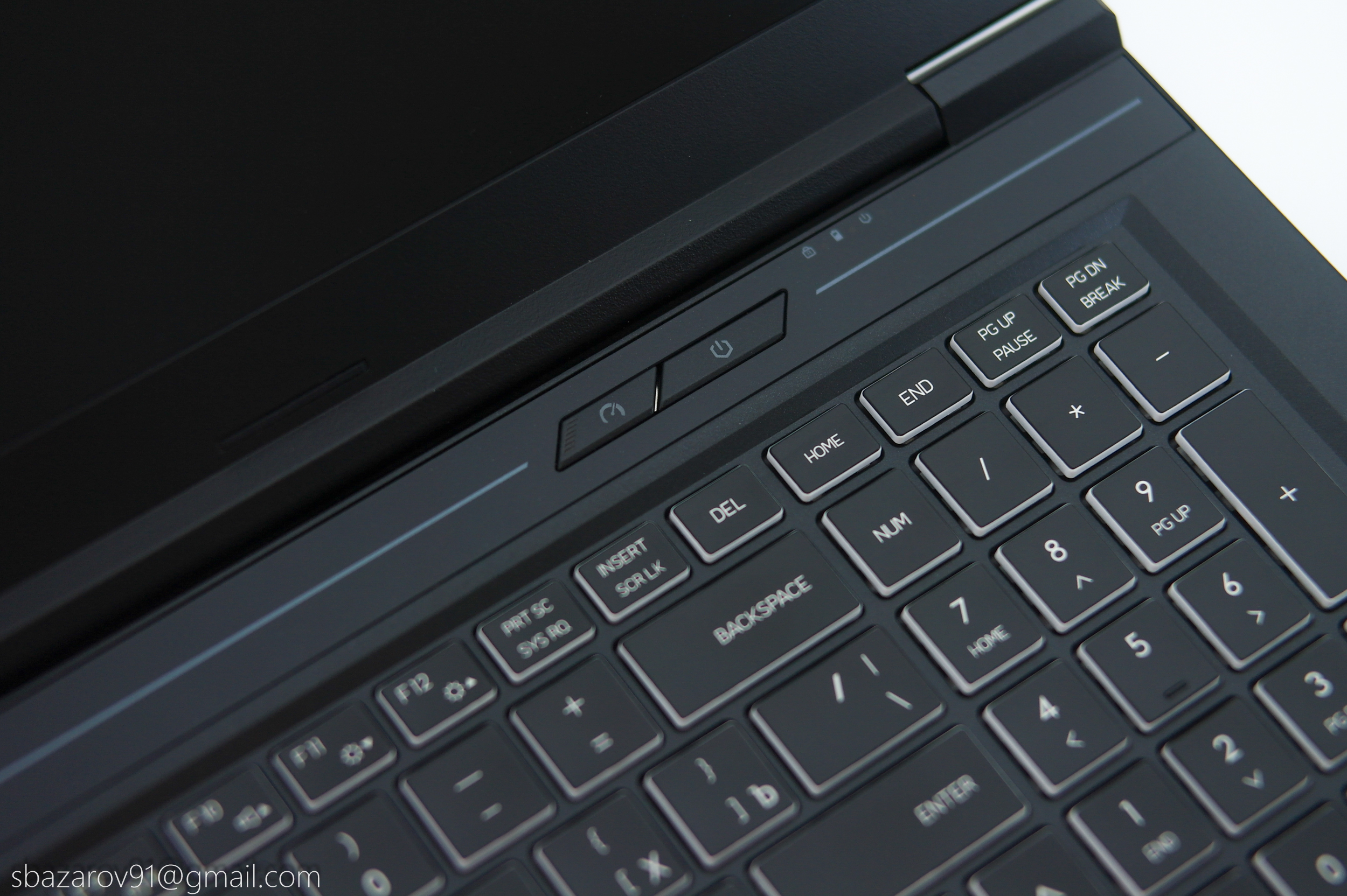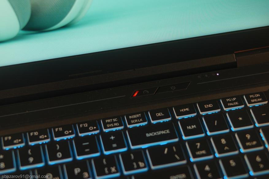 Клавиатура выполнена не в полноразмерном формате, но включает отдельный цифровой блок и клавиши Del/Home/End/PgUp/PgDn. Клавиши обладают выраженным ходом около 2 мм, что обеспечивает комфорт как при наборе текста, так и в играх. Кнопка питания вынесена в верхний ряд, где соседствует с переключателем MUX и световыми индикаторами.