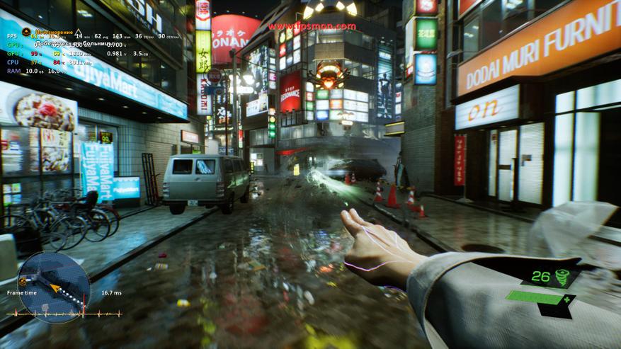 Загадочные улицы японской столицы даются системе легко — среднее количество кадров находится вблизи отметки в 60 FPS и незначительно падает в напряжённых сценах. Оперативная память загружена на 11.5 ГБ из 16 ГБ. Графическая подсистема явно испытывает трудности с рендерингом неоновых улиц, преодолевая отметку в 100 градусов. Процессор вероятно становится узким местом, имея загрузку от 27 до 40%. В целом, прогулки по пустым переулкам будут комфортными, но система испытывает трудности.