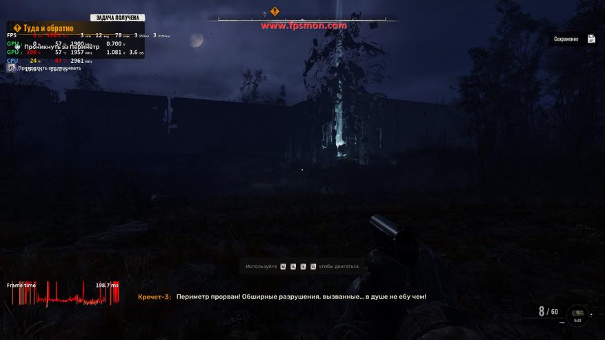 Первые шаги по радиоактивным пустошам нового S.T.A.L.K.E.R. демонстрируют серьёзные требования к системе. Игра выдаёт среднее значение в 12 FPS даже на низких настройках, что сразу настораживает. Система охлаждения ревет как реактивный самолет под 100% нагрузкой, хотя температура в 57°C ещё позволяет не беспокоиться о перегреве.