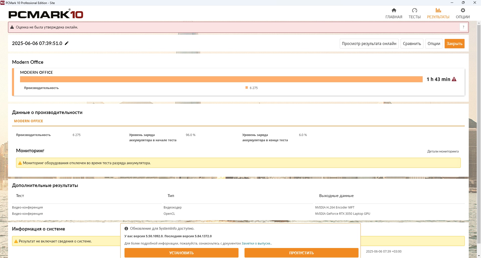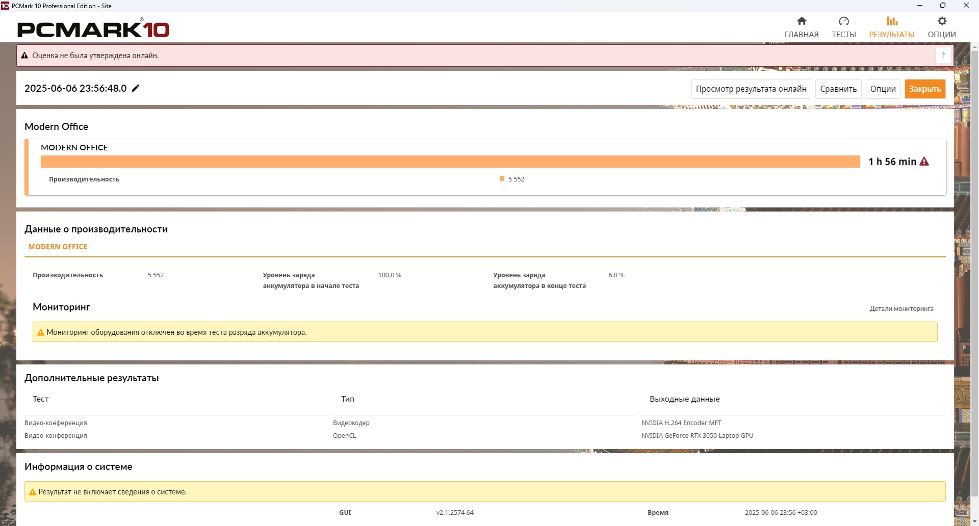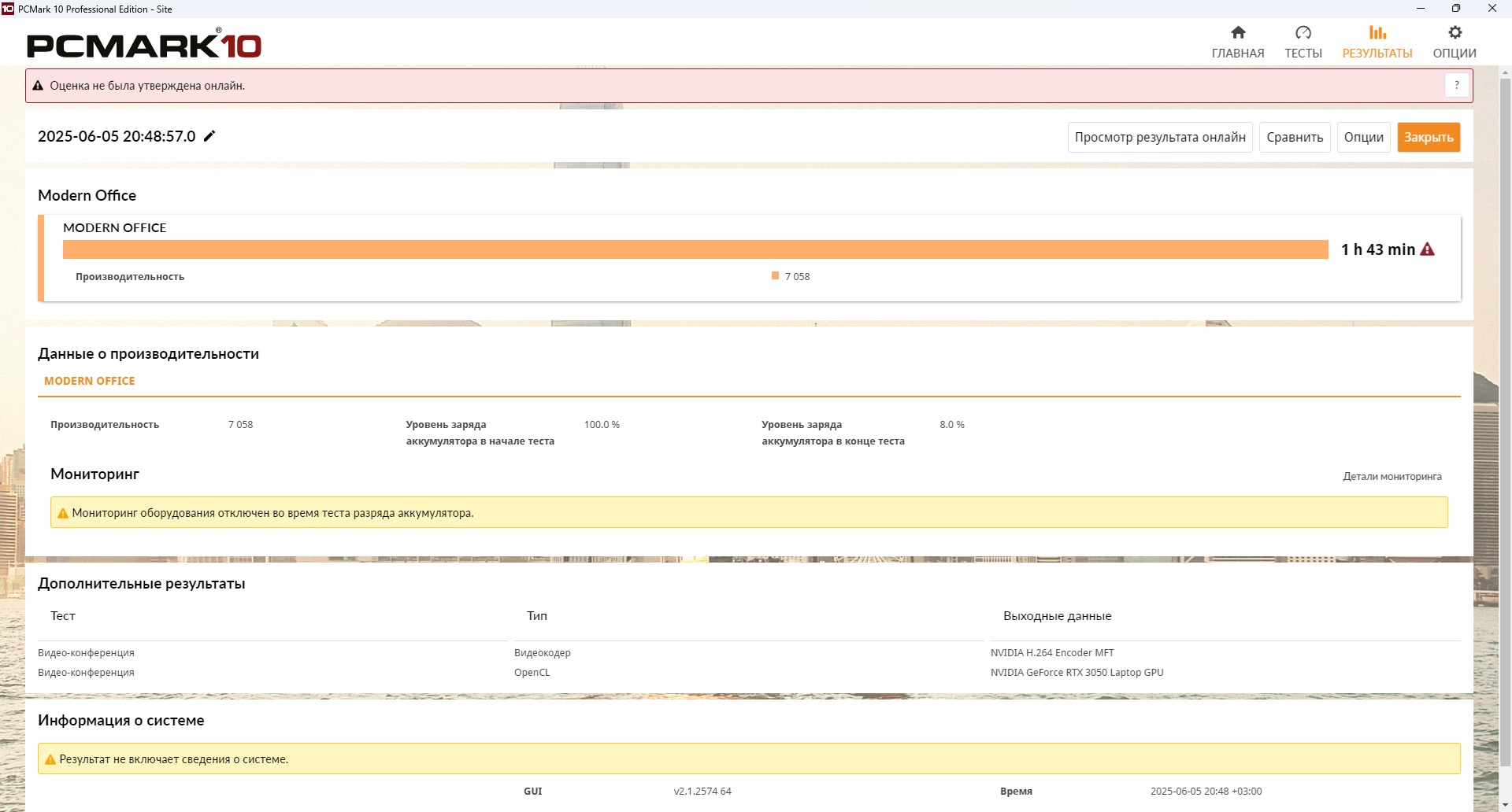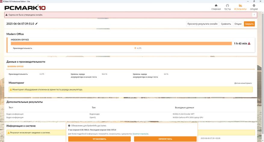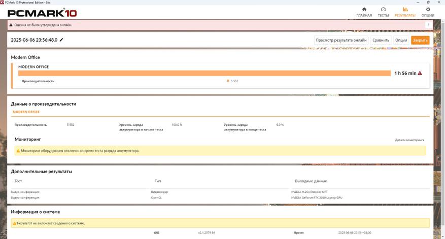 Попытки запустить аналогичный тест, но уже с помощью встроенной графики AMD Radeon 660M, не увенчались успехом: принудительное отключение видеоадаптера или перевод PCMark 10, как и отключение ползунка MUX не дало существенного прироста. Поэтому практически 2 часа — это максимум на что стоит рассчитывать. А вот время на зарядку ноутбука быстрое и составляет 1 час 58 минут.