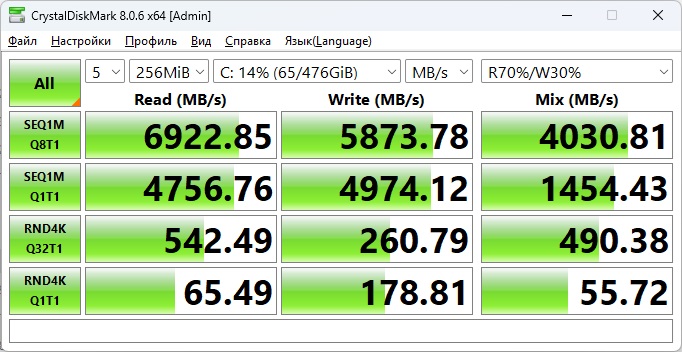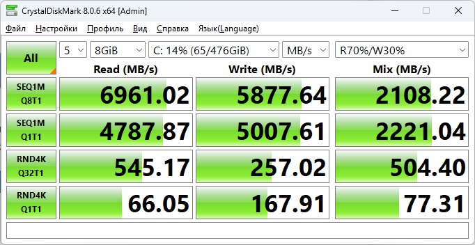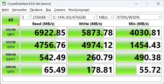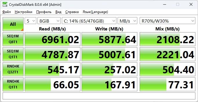 Далее переходим к накопителю, который встречает нас YANGTZE YMTC PC411, работающий на пиковых скоростях в 7 Гб/с. У него хорошие результаты работы со всеми блоками, так что менять на что-то иное не вижу смысла.