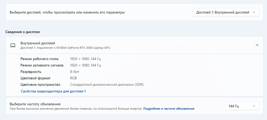 Максимальное разрешение экрана — 1920x1080 точек с частотой обновления 144 Гц. В настройках доступен выбор между 60 Гц и 144 Гц, хотя через панель управления видеокартой можно установить и промежуточные значения. Однако после 144 Гц возвращаться к меньшим значениям уже не захочется.