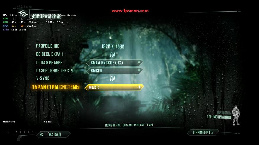 Перед нами конфигурация, которая не просто «тянет» Crysis 3, а делает это с запасом. Если в 2013 году за 60 FPS в этой игре приходилось бороться, то сейчас даже не самые топовые системы справляются с ней легко.