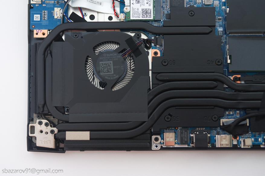 Внутри установлена массивная система охлаждения с пятью медными тепловыми трубками, необходимыми для отвода тепла от мобильной RTX 3050 (4 ГБ VRAM) и 6-ядерного AMD Ryzen 5 6600H (в пике они могут потреблять до 150 Вт).