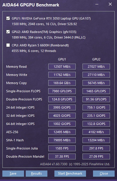 Тестирование графики производим в 2 этапа с использованием интегрированной и встроенной графики. Встройка AMD Radeon 660M демонстрирует впечатляющую скорость работы с памятью — 27 ГБ/с при чтении и 27 ГБ/с во время записи, что значительно превышает аналогичные показатели дискретной видеокарты NVIDIA GeForce RTX 3050 так как iGPU работает напрямую с CPU. Однако при операциях копирования данных ситуация меняется: NVIDIA показывает результат 169,64 ГБ/с против 56,7 ГБ/с у Radeon 660M.