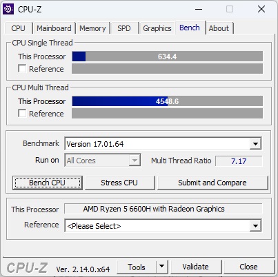 А теперь смотрим на производительность системы через различные бенчмарки. Основным показателем «мощности» процессора являются результаты одноядерного и многоядерного теста. В тесте CPU-Z AMD Ryzen 5 6600H набирает 634/4548 очков, что ставит его на один уровень с Intel Core i7-11700K/ AMD Ryzen 5 PRO 5650G.
