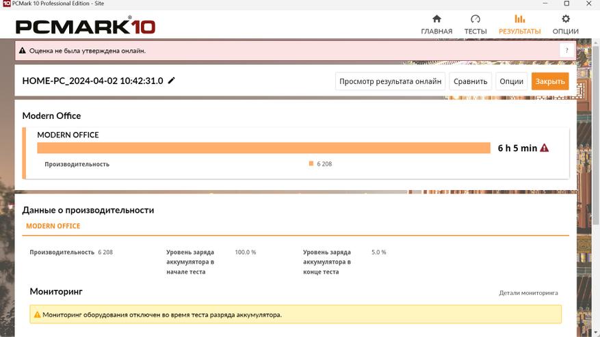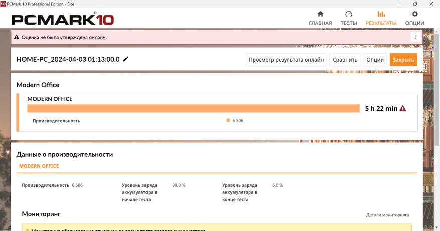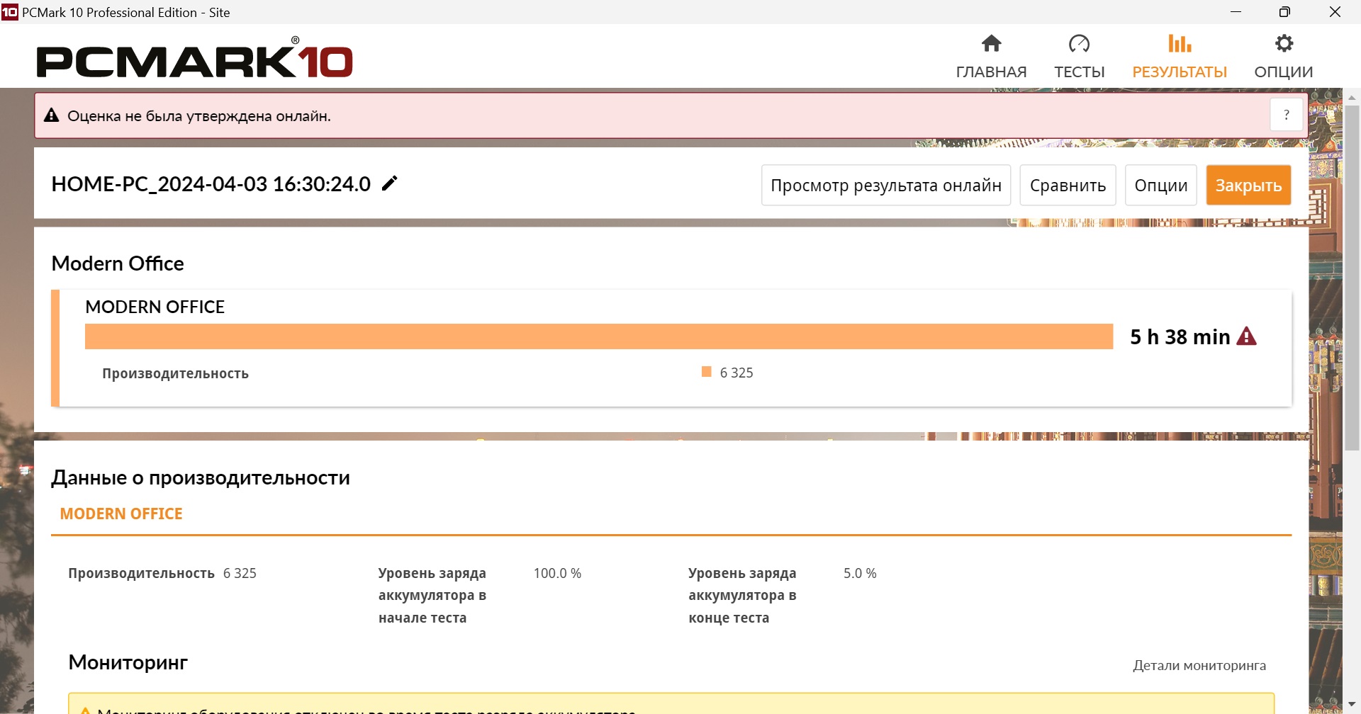 Производитель указывает, что их ноутбук может работать без подзарядки до 4х часов. Для этого я провёл три теста в разных режимах работы при максимальной яркости. В результате, минимальное время работы составило 5 часов 38 минут в режиме высокой производительности, 5 часов 22 минуты при сбалансированной нагрузке и 6 часов 5 минут при низком энергопотреблении. Для компактного и легкого ноутбука это достаточно хороший результат, но не стоит забывать о том, что максимальная яркость не такая высокая, как хотелось бы.