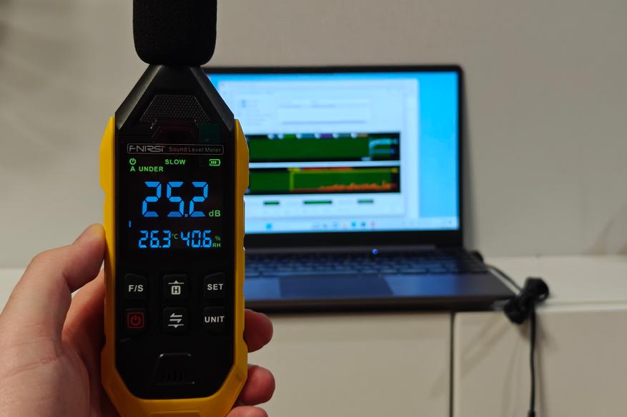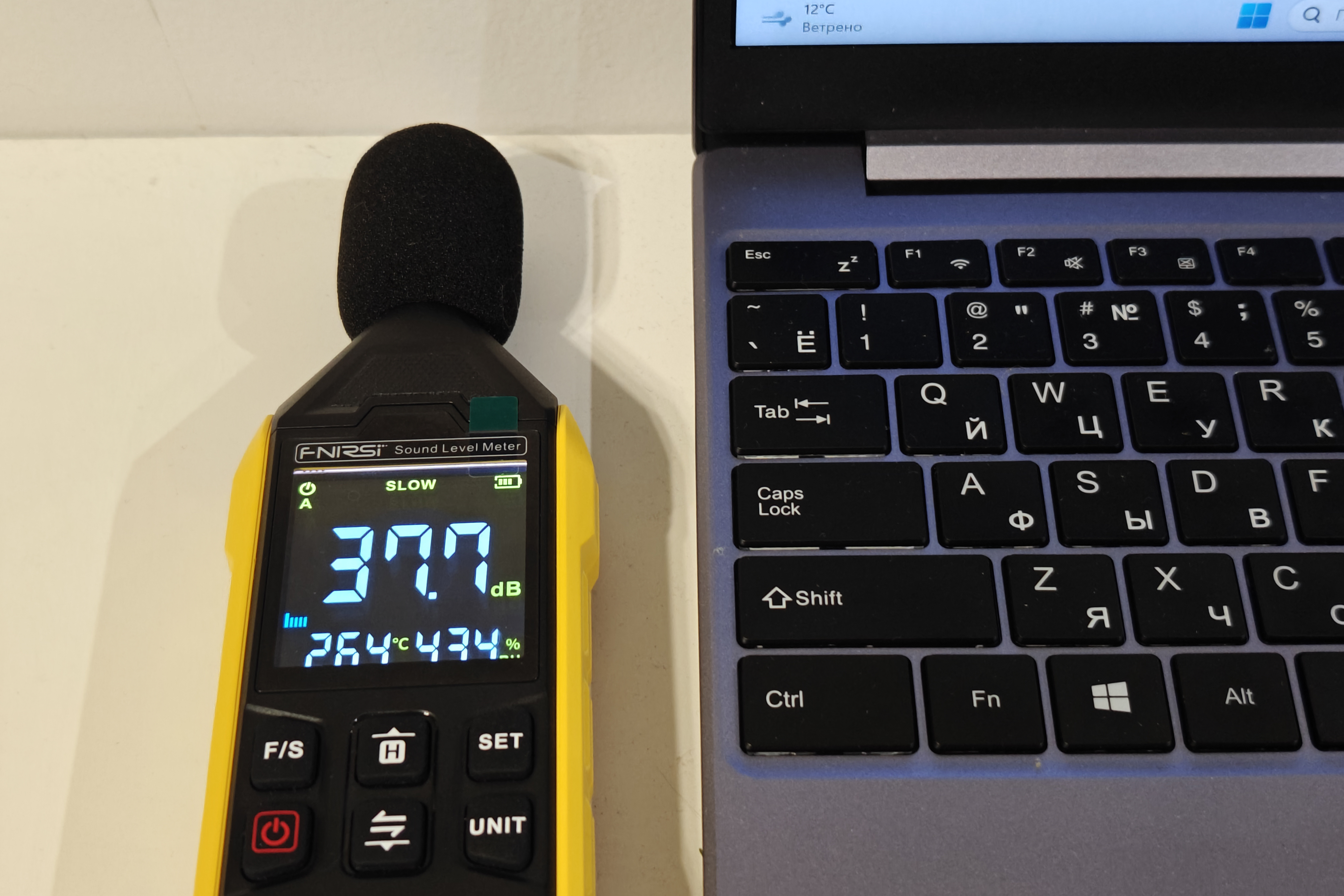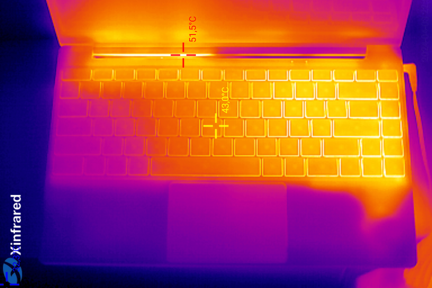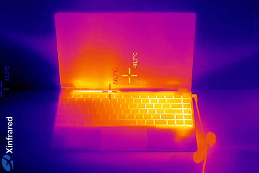 При взгляде на ноутбук через тепловизор можно наблюдать работу системы охлаждения, которая отводит значительное количество тепла из корпуса. При этом уровень шума системой охлаждения с расстояния 80см не превышает 25дБ, а в непосредственой близости к ноутбуку составляет 37.7дБ.