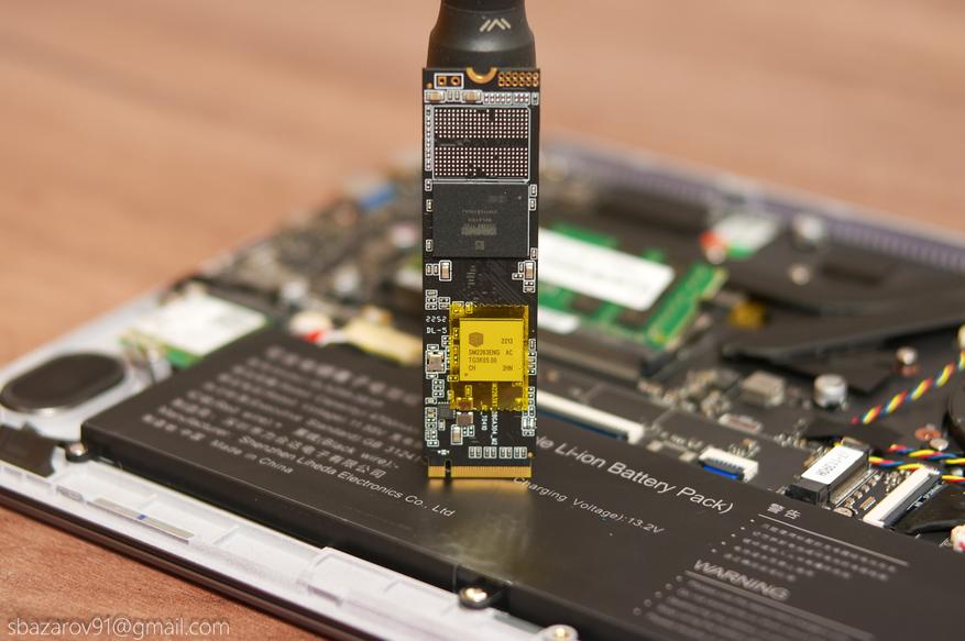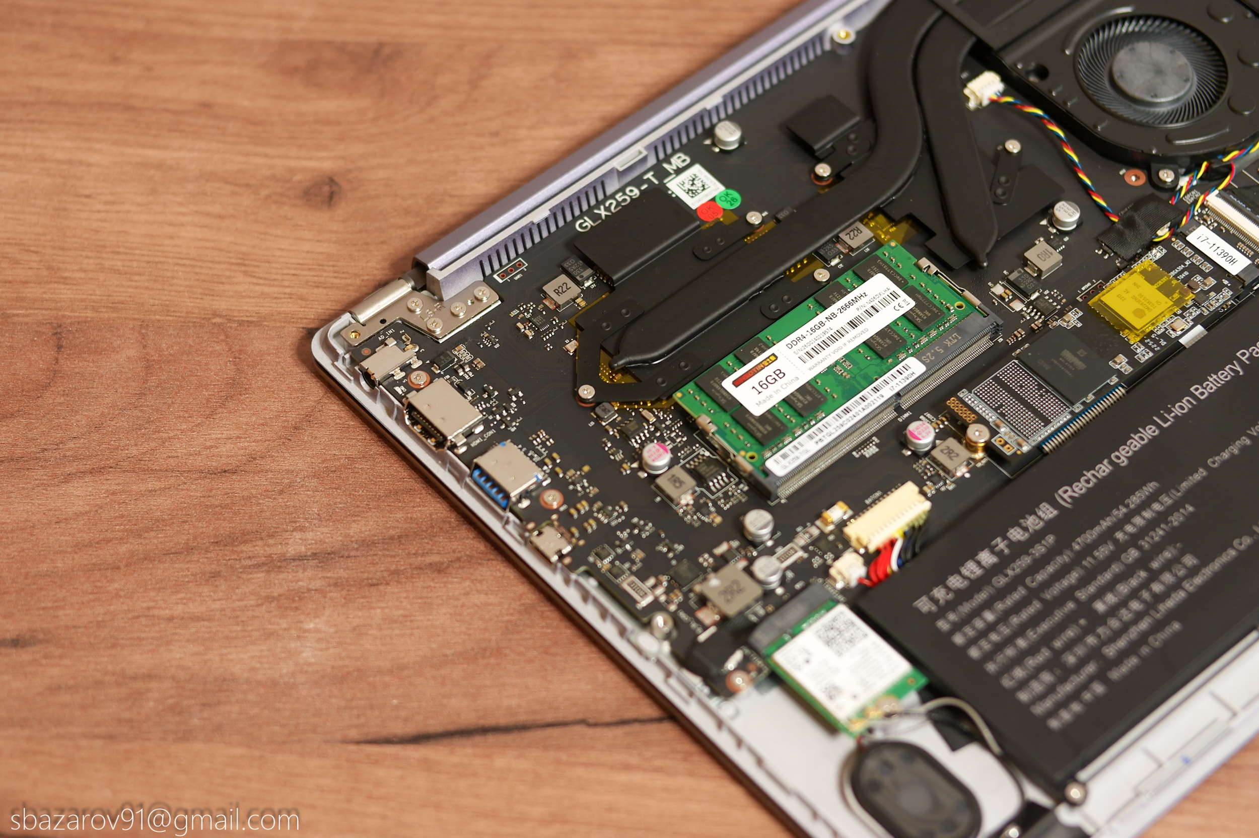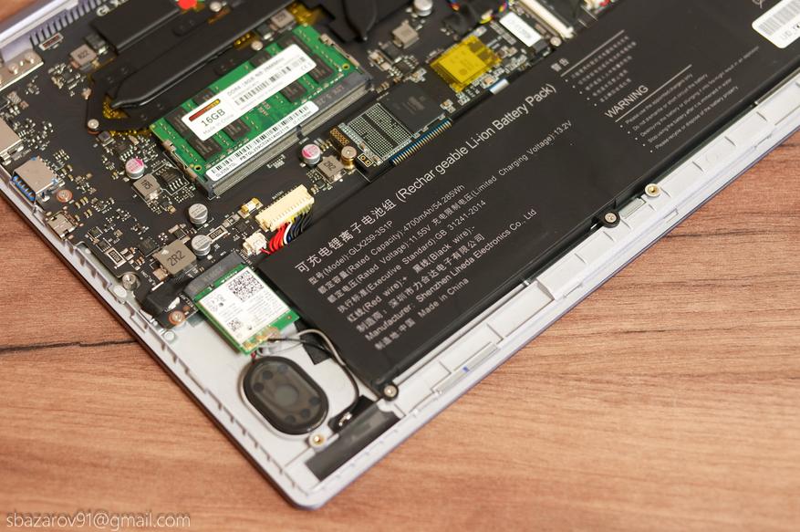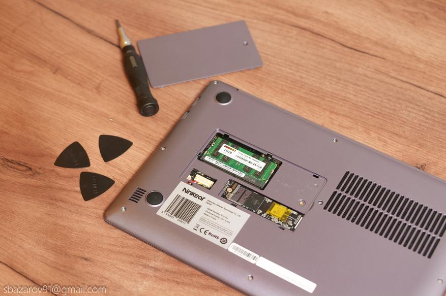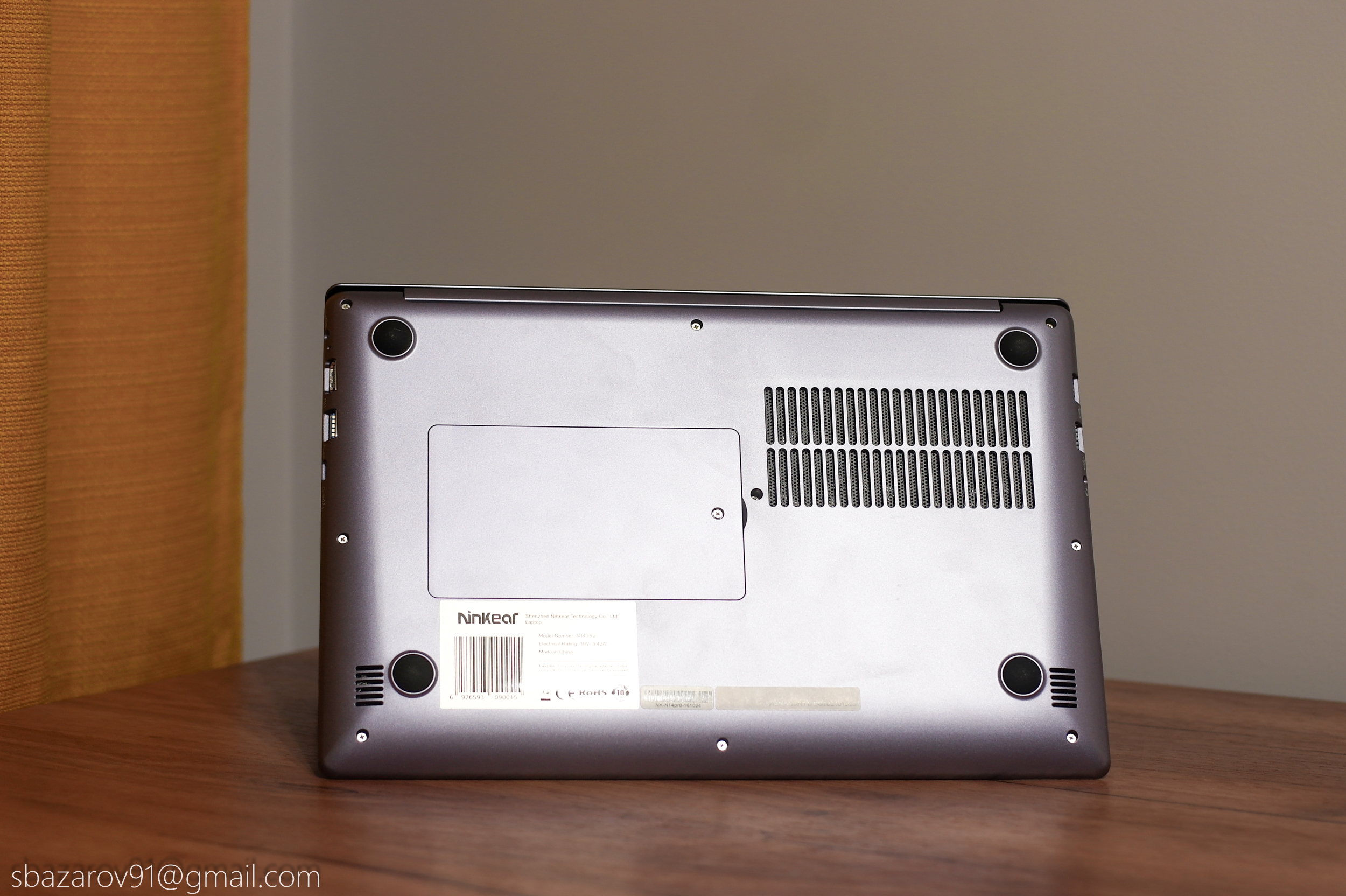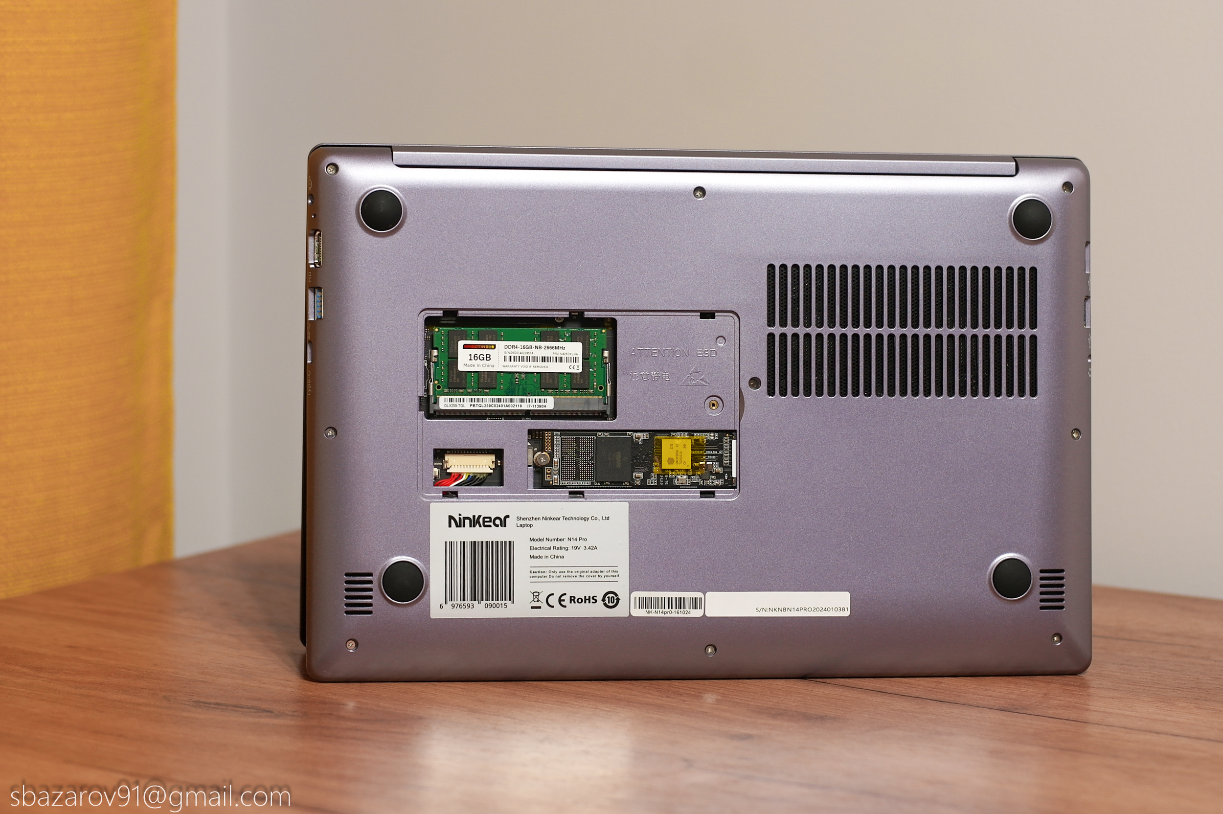 На обратной стороне находится лючок для быстрого доступа к апгрейду ноутбука: можно заменить оперативную память DDR4 (работает в одноканальном режиме) и M.2 SSD накопитель. Так же под крышкой можно обнаружить шлейф аккумуляторной батареи для экстренного отключения питания ноутбука. На моей памяти, Ninkear N14 Pro первый ноутбук с возможностью «горячей» замены компонентов без полного съема задней крышки.