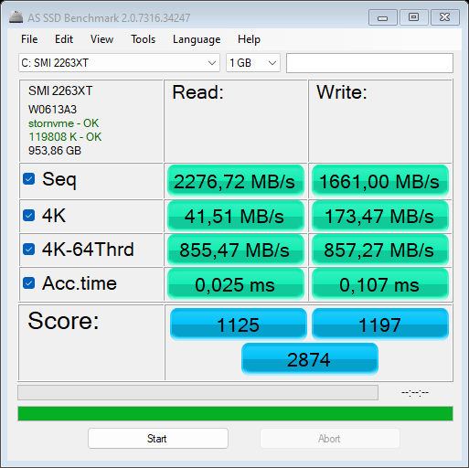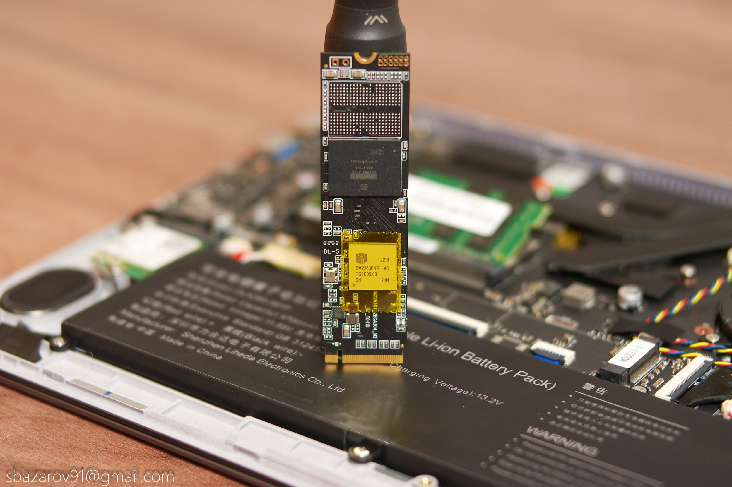 Внутренний накопитель M.2 типом подключения. В качестве контроллера применяется SM2263ENG, тогда как в качестве чипа памяти SanDisk с максимальной скоростью 2.2 GB/s при чтении и 1.7GB/s во время записи. Различные сценарии энергопотребления (макс.эффективность, сбалансированный режим или макс. энергоснабжение) не влияют на скорость его работы.