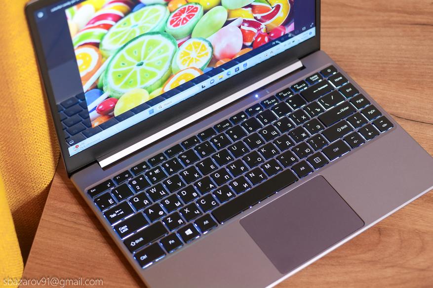 Внутренний облик N14 Pro также получил ряд изменений — клавиши избавились от скруглённых краёв, кнопка включения переехала с правой боковой грани на верхний ряд клавиатуры, а сканер отпечатка пальцев и вовсе лиши не устанавливать в данную модель. Что касается клавиатуры и её наполнения, то тут без изменений — 84 мембранных клавиши островного типа, гравировка с русскоязычными символами и 2 ступени подсветки. Тачпад средних размеров, окрашенный в темно-серый цвет (выделяется на фоне остального пластика).