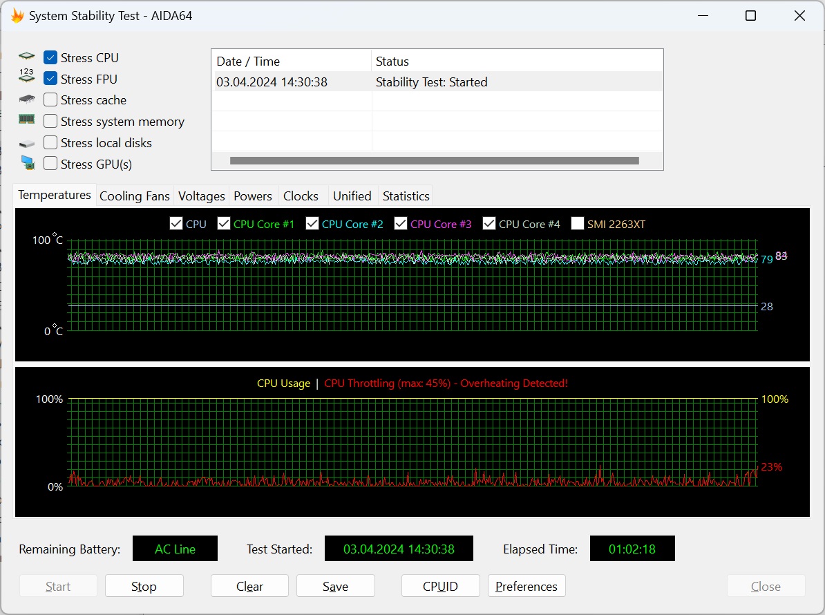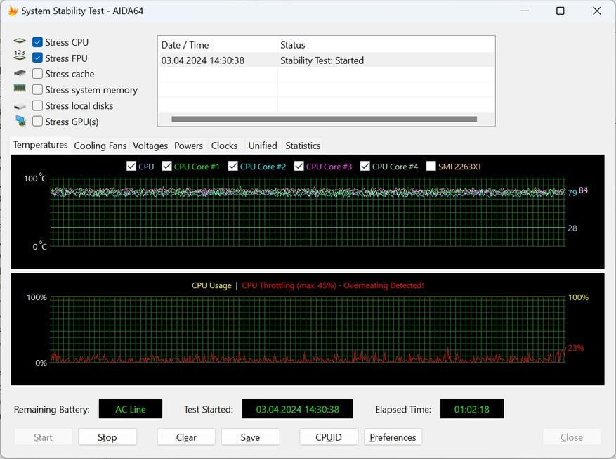 Заключительным тестом запустим AIDA64 и посмотрим на результаты ноутбука в стресс тесте. При 100% нагрузке можно наблюдать небольшой троттлинг, а так же температуру CPU в 79 градусов (максимальная температура CPU по паспорту 100°C). Однако в обычной эксплуатации такая присадка не ощущается.