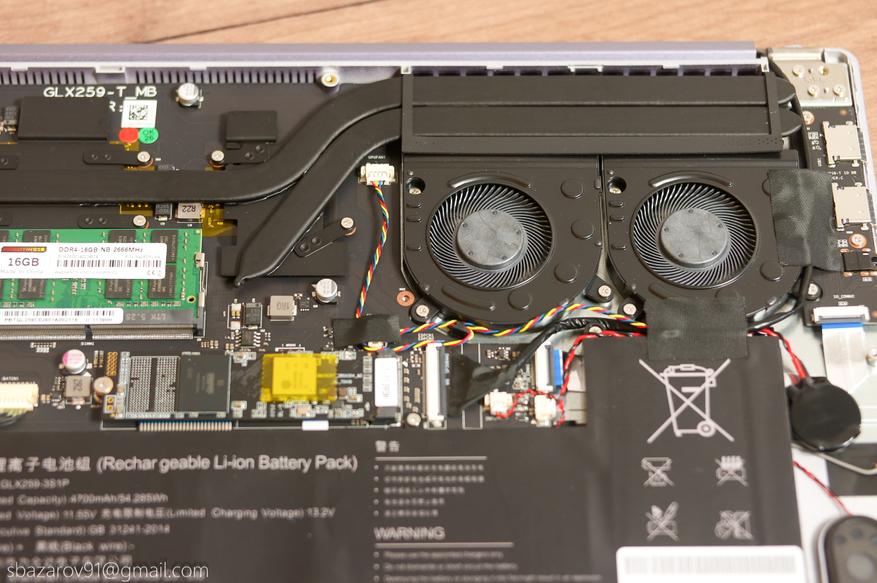 Встроенный аккумулятор GLX259 собран по схеме 3S1P и имеет ёмкость 4.7Ah (54,285Wh). Рабочее напряжение 11,55V. При желании можно заменить на аналогичный, благо они продаются на Aliexpress.