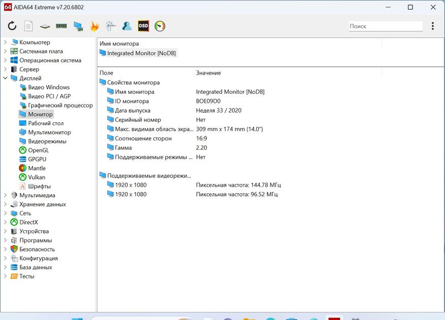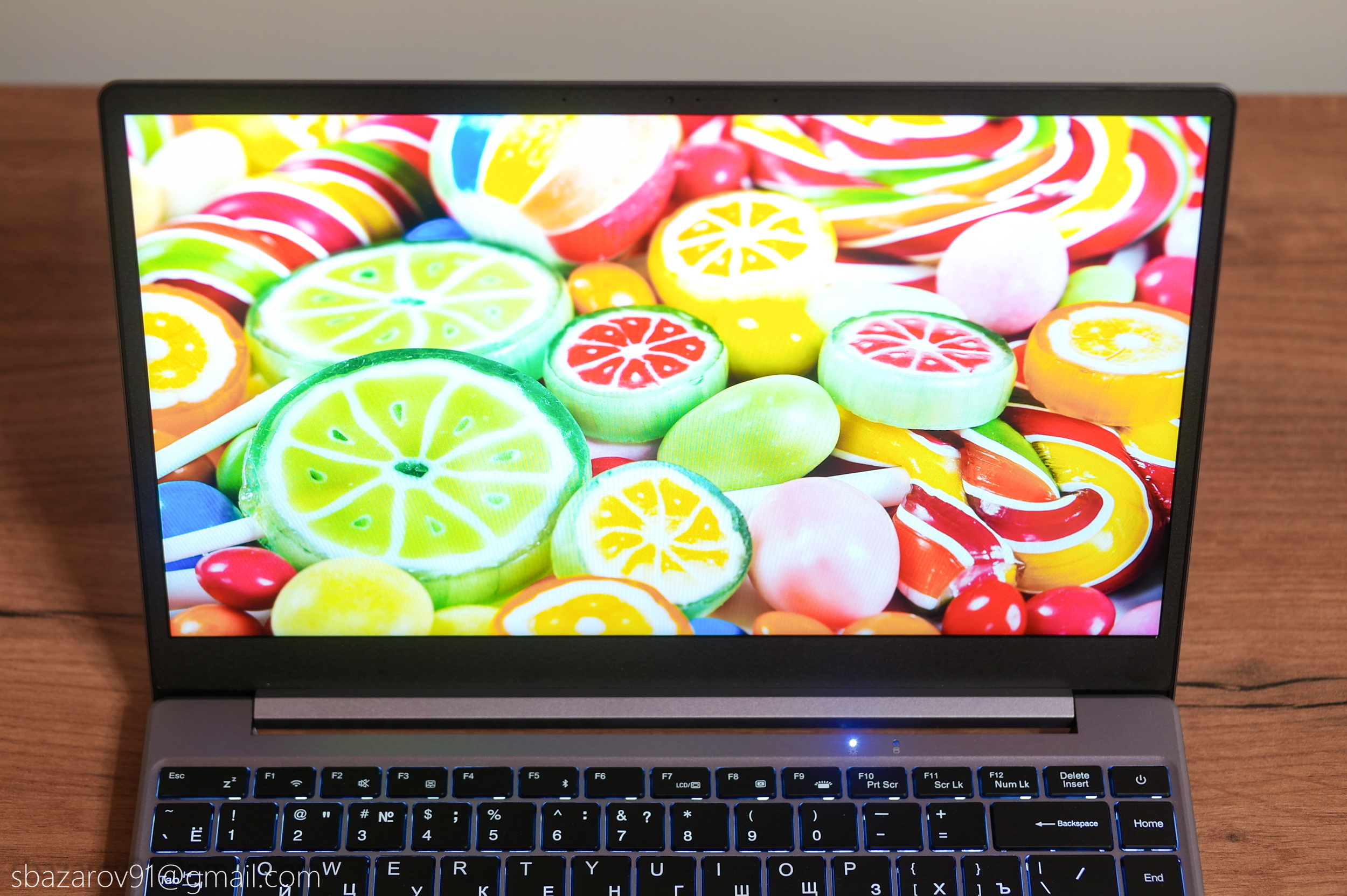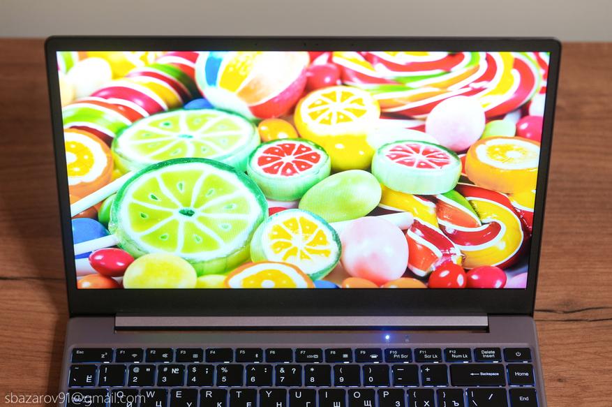 Что касается экрана, то перед нами 14 дюймовая матовая IPS панель с разрешением 1920*1080 пикселей и частотой 60Гц (Матрица NV140FHM-N3X (BOE09D0)). Максимальная яркость ограничена 180нит, а значит при малейших солнечных лучах экран будет слепнуть. В темном помещении комфортно работать при яркости от 60%. Цветовой охват соответствует 66% sRG, либо 45% NTSC, поэтому просмотр различного контента будет в привычных цветах, а глубина черного цвета и общая контрастность и вовсе без нареканий.