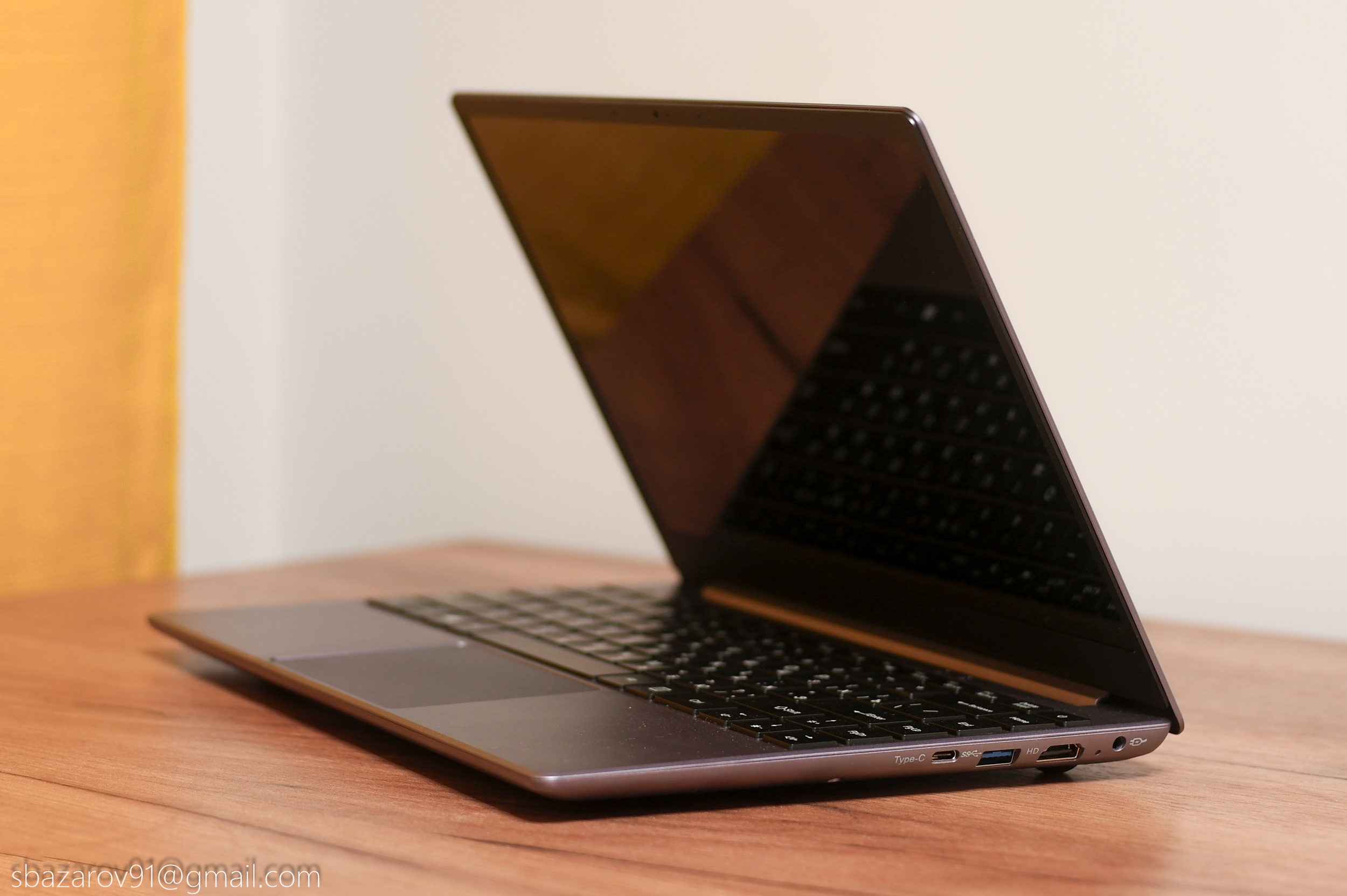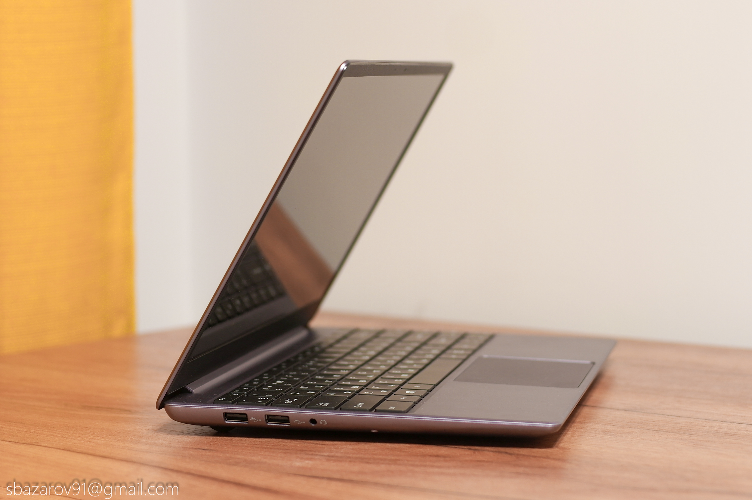 По части подключения все также скромно, на левой боковой грани — пара USB2.0 и 3.5mm разъем для подключения наушников, на правой грани — DC для зарядки, HDMI1.4, USB3.0, Type-C. Заряжать ноутбук через GAN зарядки не выйдет, Type-C используется только для передачи данных.