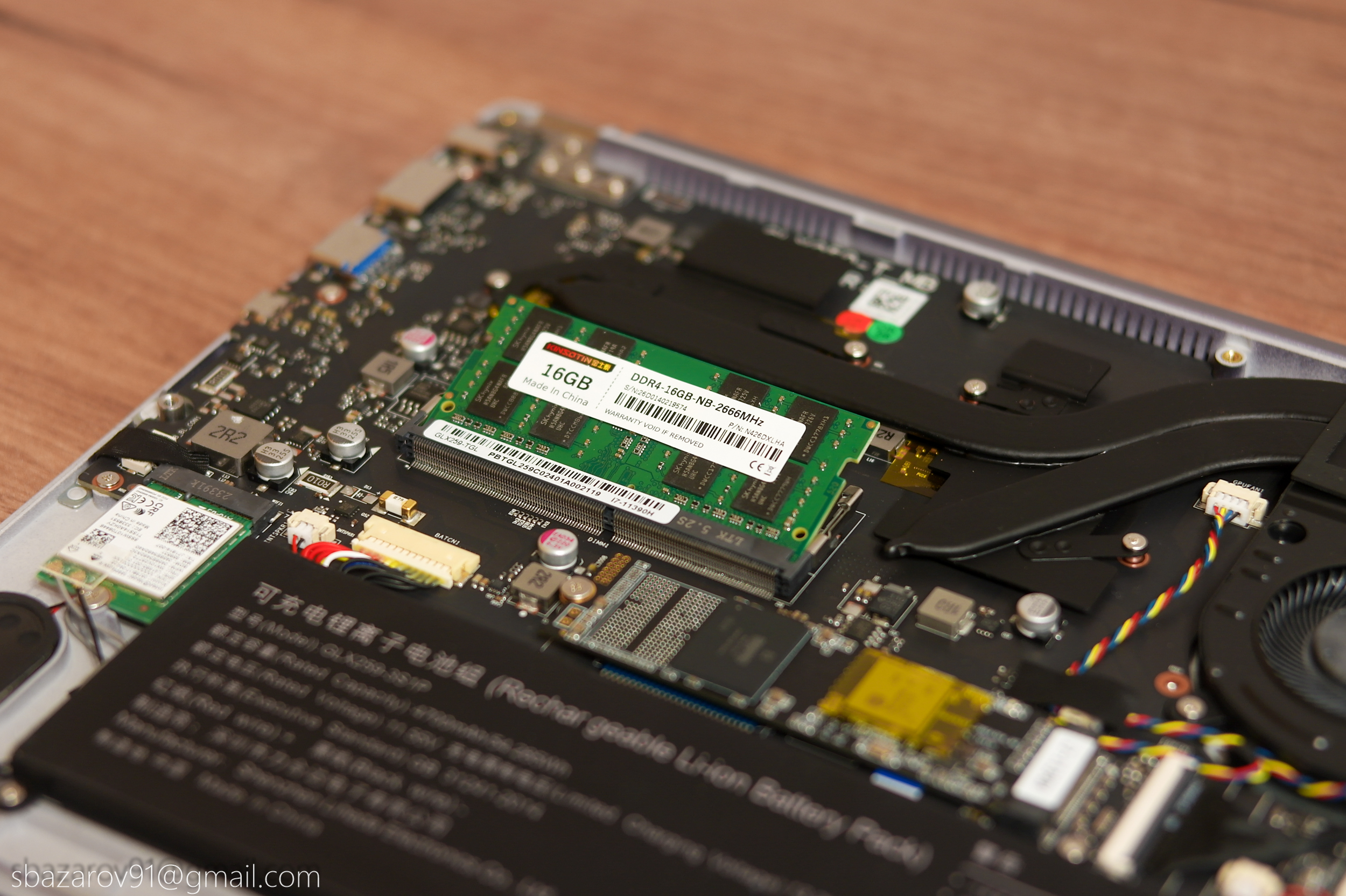 Если сравнивать текущую материнскую плату и плату предыдущего поколения, то можно заметить, что она практически не изменилась. Здесь также присутствует пара вентиляторов и пара тепловых трубок, а также доступ к съемной оперативной памяти и внутреннего накопителя. Нарекание к RAM заключается не только в устаревшем DDR4-2666 типе, но и в единственном слоте, а значит нас ожидает работа в одноканальном режиме. В качестве производителя выступает Kinsotin, который является частым гостем в ноутбуках Ninkear.