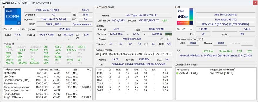 В первую очередь запустим HWInfoTest для общего сбора информации о железе ноутбука. Прежде всего стоит сказать, что за Ninkear N14 Pro просят чуть больше 560$ долларов за мою комплектацию (16/1024GB), тогда как фактически перед нами компактная рабочая лошадка с хорошим и производительным CPU. На первый взгляд может показаться дорого. Идём дальше.