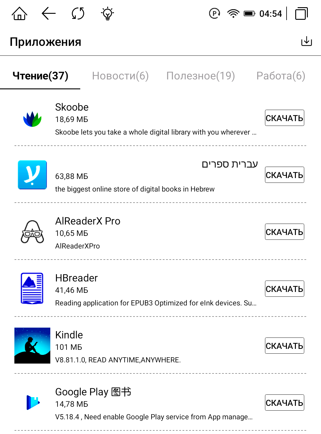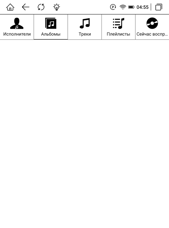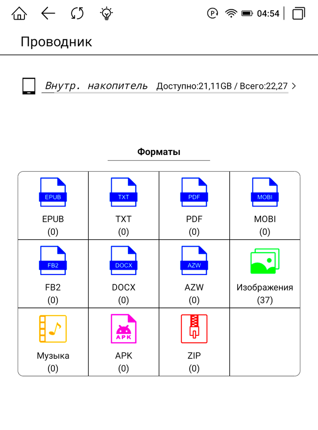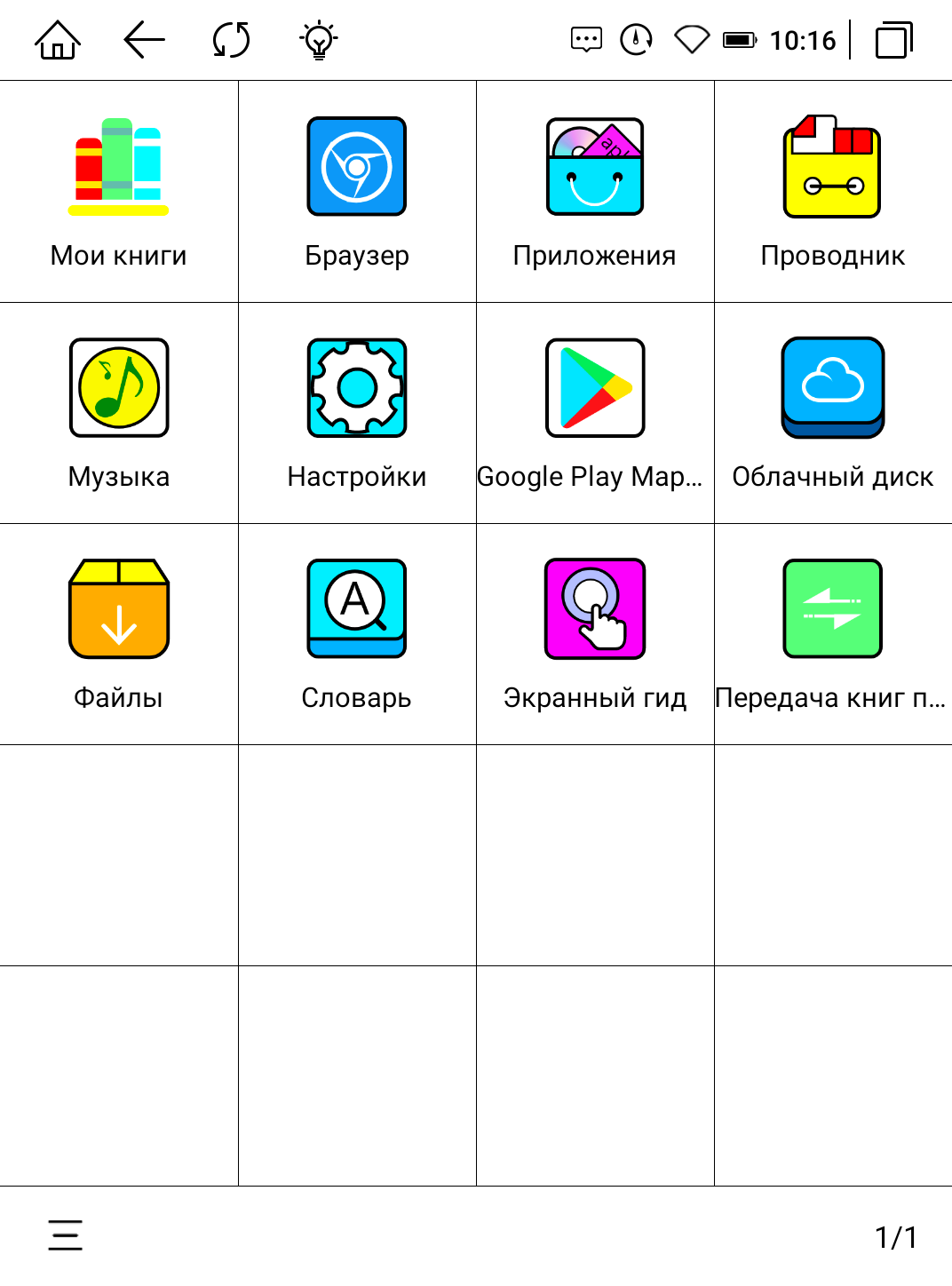 Следующая кнопка «Приложения». Здесь мы найдем большое количество доступных «из коробки» приложений, это и редакторы, и приложения для чтения, и даже игры. Как и в других разделах, здесь есть подразделы для удобной сортировки приложений. Всего подразделов 4 и каждый из них уже наполнен приложениями. Так мы получаем 37 приложений для чтения, 6 приложений для изучения новостей, 19 полезных приложений и 6 приложений для работы. Весьма заботливо со стороны производителя, ведь мы можем сразу приступать к работе или чтению, не тратя время на поиск всех этих приложений, все основное уже имеется на устройстве. Для того чтобы не занималось место, они не установлены на устройство, а доступны как ярлыки. Скачиваются при необходимости. Далее следует кнопка «Проводник». Здесь мы найдем классификацию файлов по типам и прямой доступ к внутреннему накопителю памяти, где также все файлы разбиты по папкам. Следующая кнопка «Музыка» с классификацией треков по альбомам, исполнителям и плейлистам. Мы можем подключить свои беспроводные наушники (через Bluetooth) и насладиться любимыми треками.