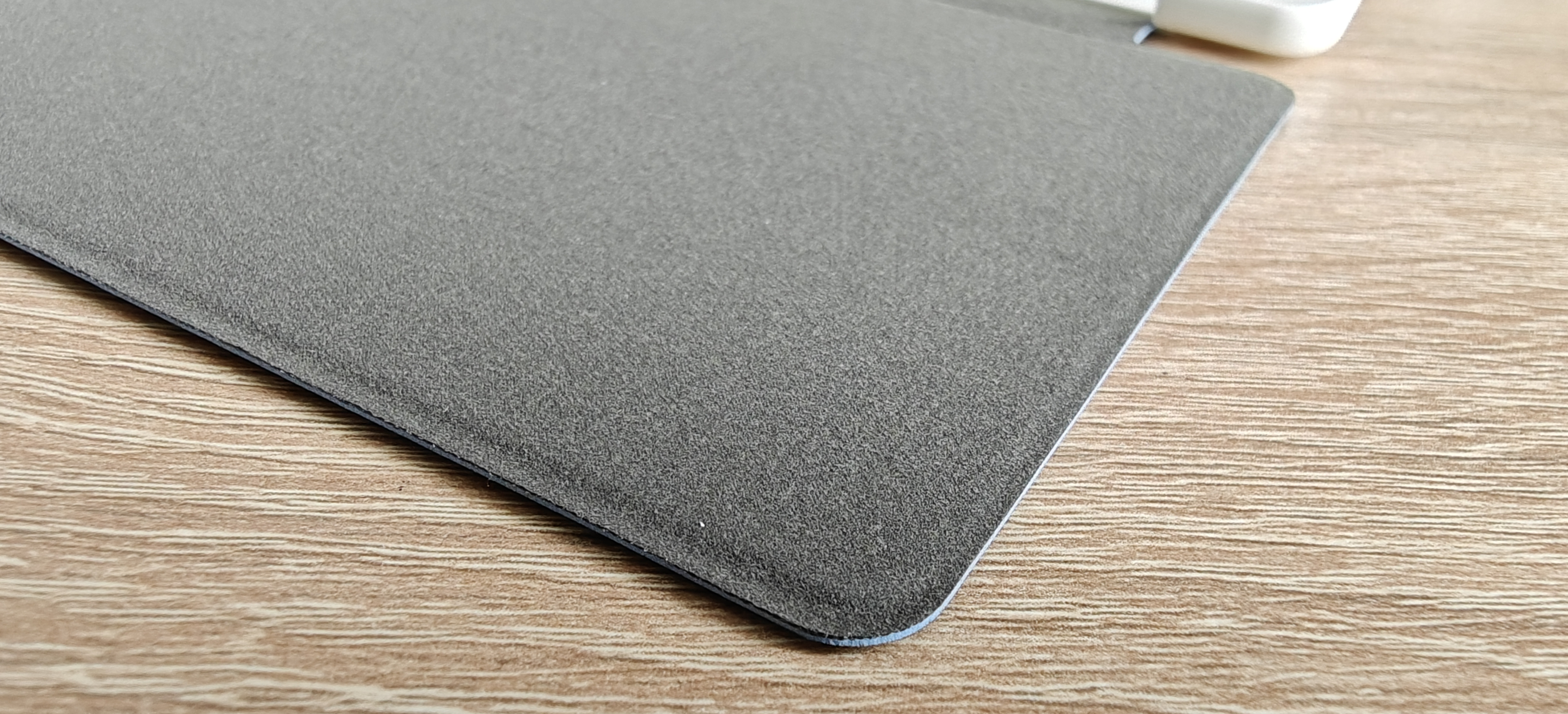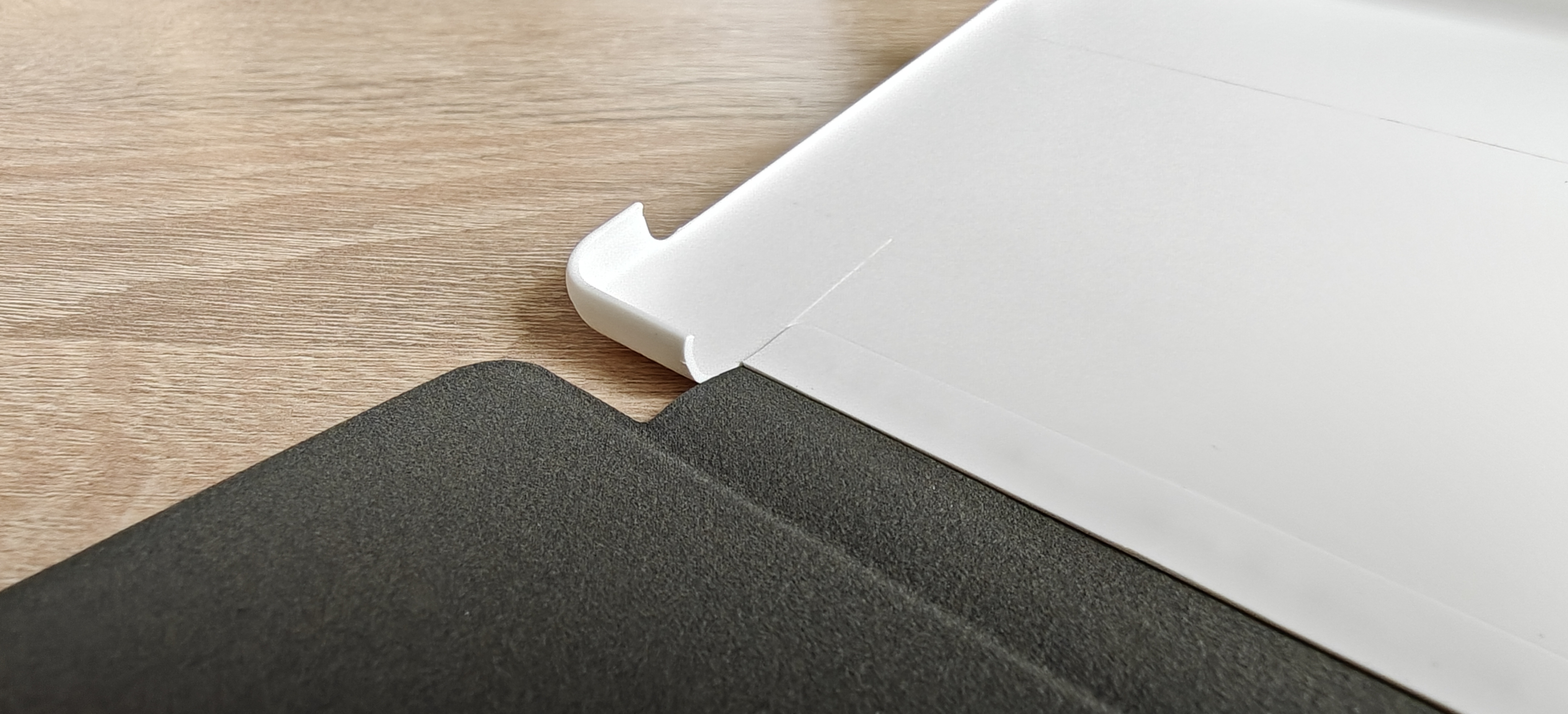 Основа чехла изготовлена из пластика белого цвета с имитацией кожи на внешней поверхности. Крышка чехла выполнена в приятном, глубоком, спокойном синем цвете с небольшим теснением логотипа в правом нижнем углу. Материал тактильно приятен, напоминает замшу. С внутренней стороны покрытие крышки серого цвета, также имитирует замшу, но ощущается более грубым.