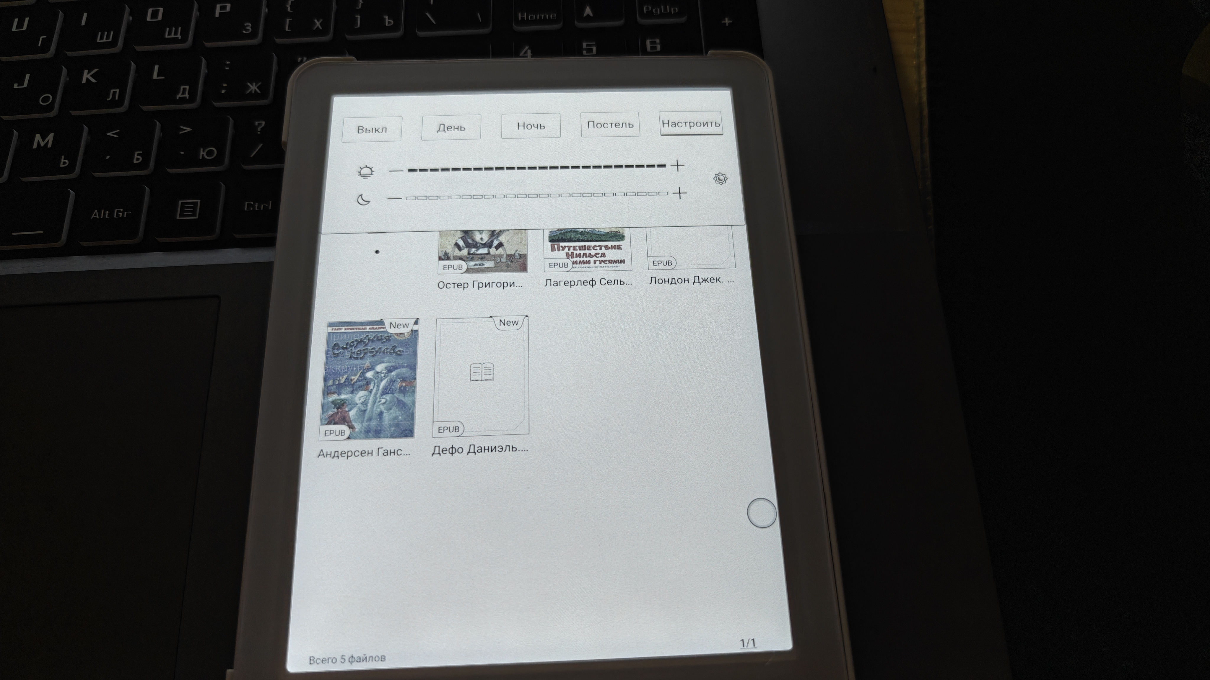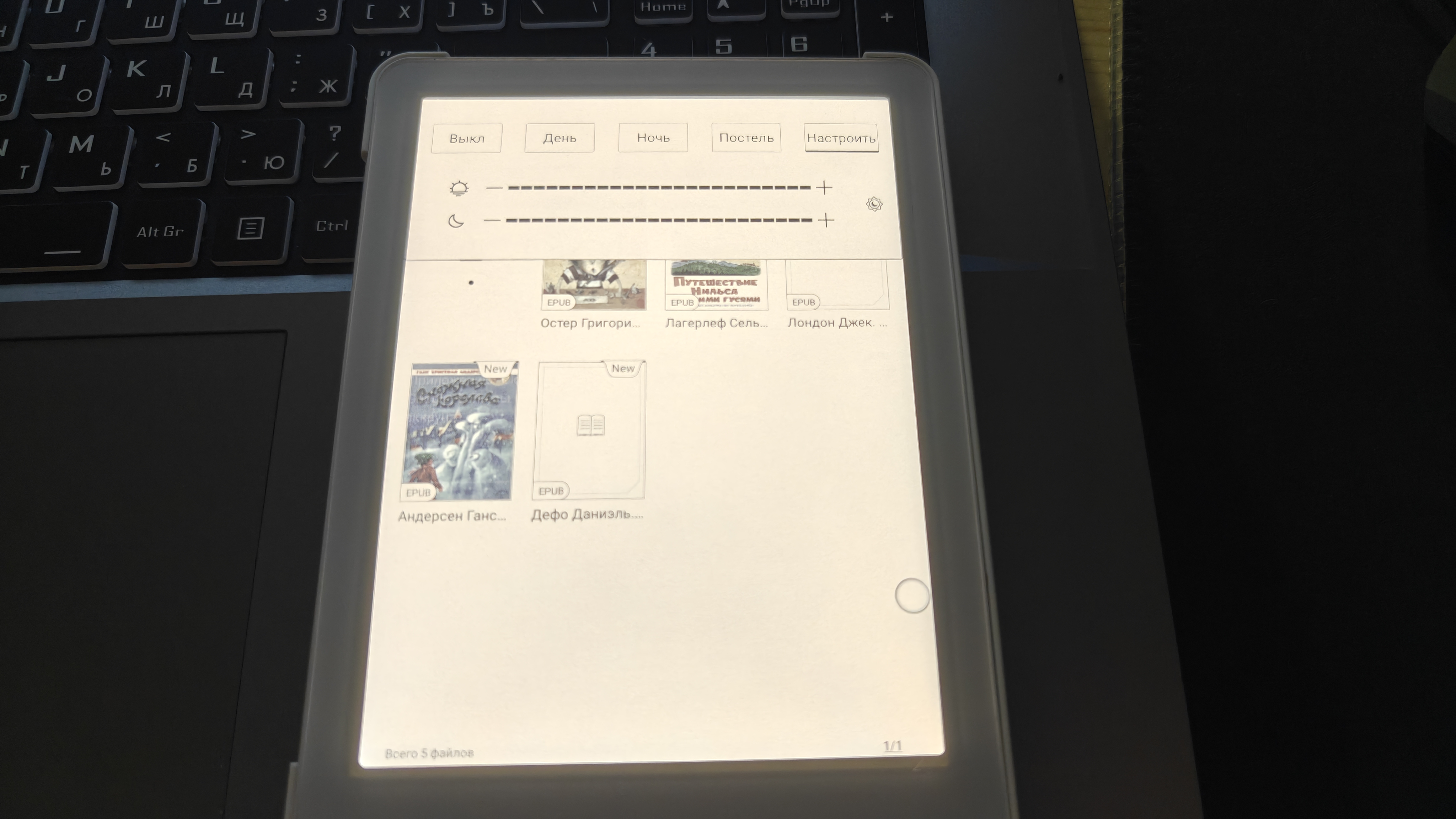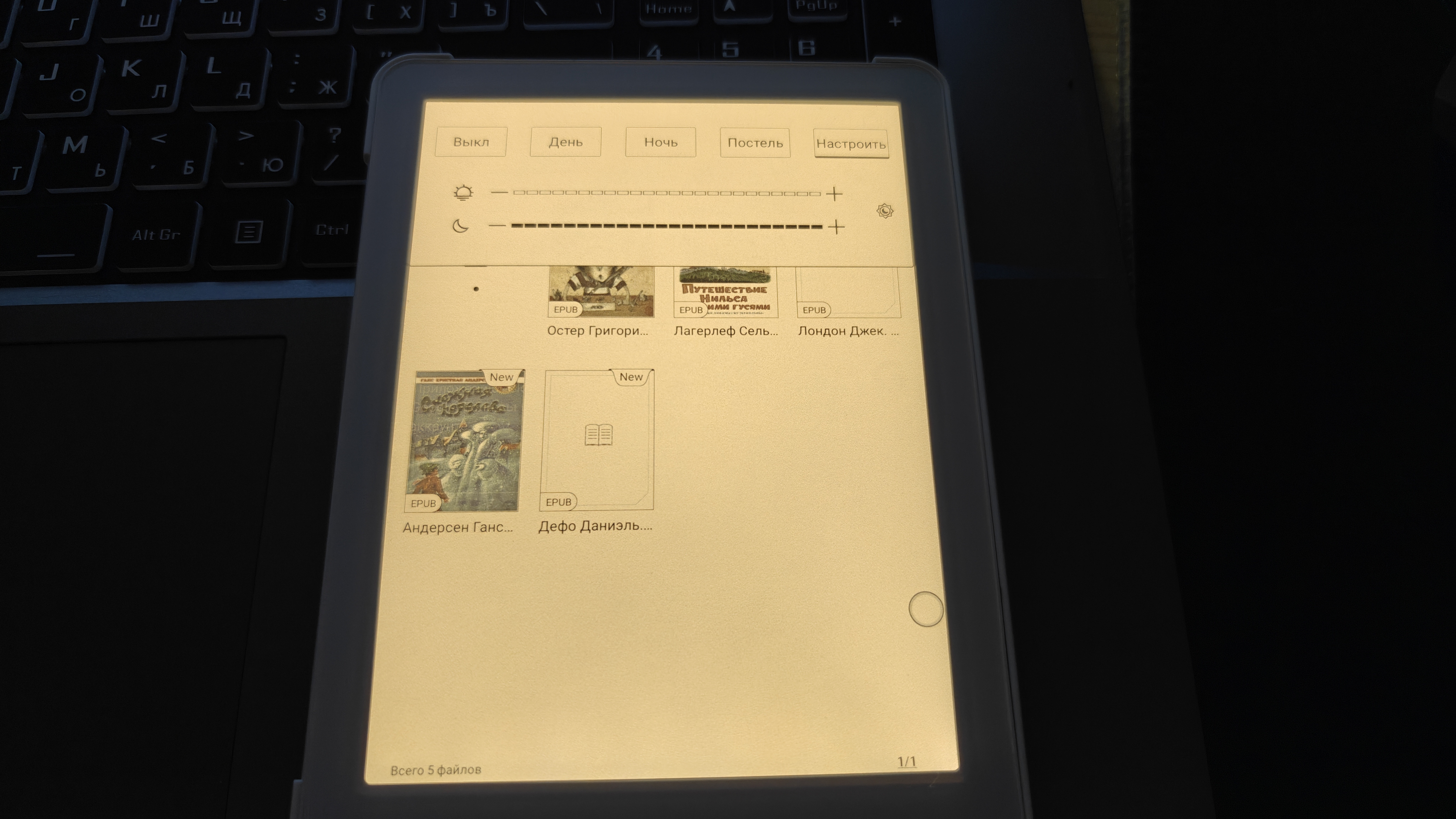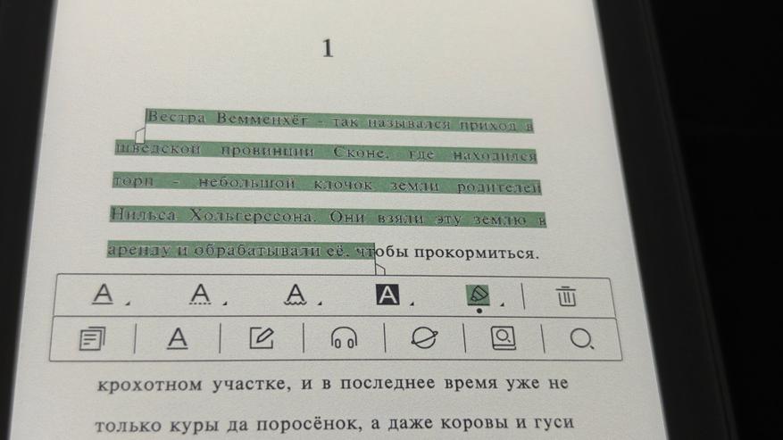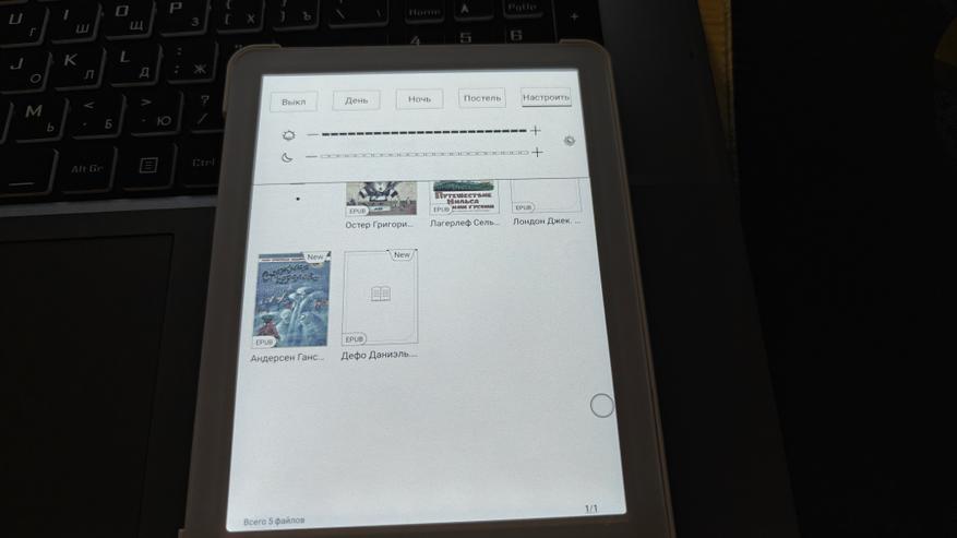 Как видим, у нас полноценный редакторский инструментарий с возможностью поиска текста и информации в интернете. Для нашего удобства книга оборудована регулируемой подсветкой. Во-первых, есть предустановки для чтения днем, ночью и без подсветки. А во-вторых, мы можем вручную отрегулировать требуемую яркость и оттенок подсветки. Отключить подсветку и читать как книгу, конечно, тоже можно.