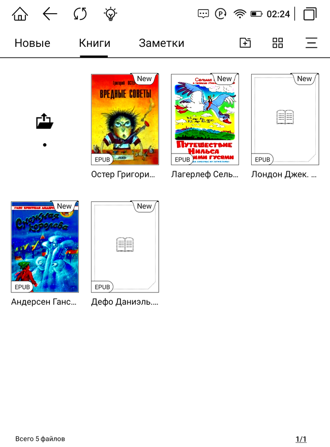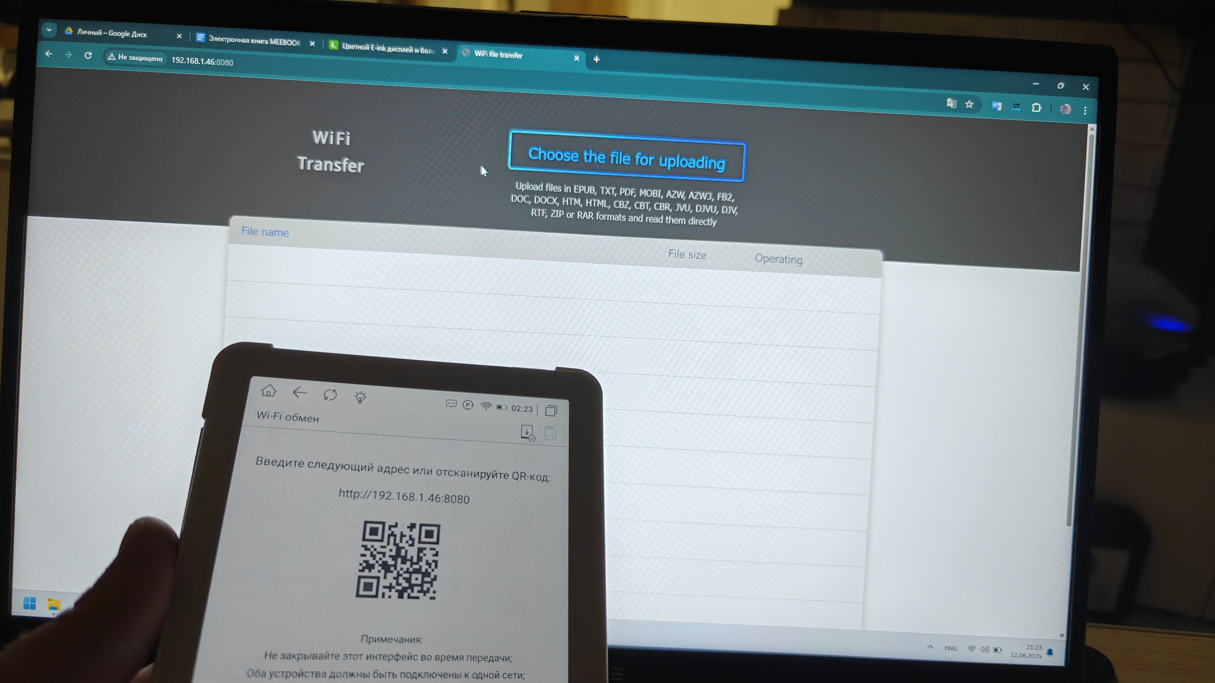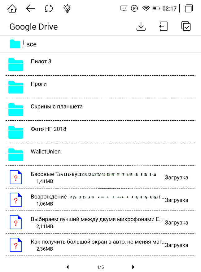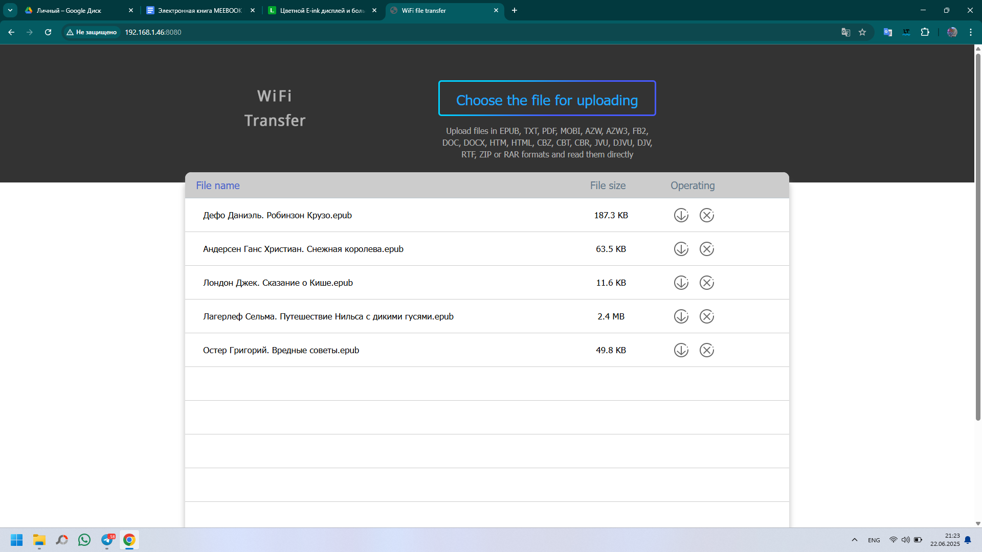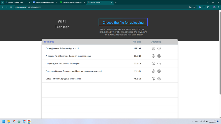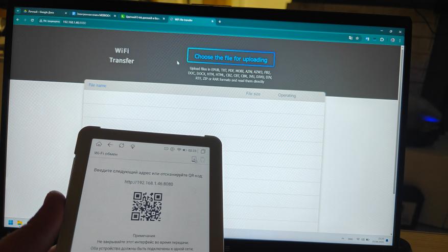 Книги, как и, собственно, любые файлы можно загрузить на книгу любым удобным для вас способом, начиная с классического копирования «по проводу», используя Wi-Fi обмен, или скачать из облачных хранилищ и с просторов интернета. При подключении кабеля аккумулятор еще и заряжается, о чем нам сообщает соответствующий индикатор. Wi-Fi обмен максимально прост. Вводим указанный на экране книги адрес в браузер ПК и простым копированием перемещаем требуемые книги. Список форматов широк и разнообразен. При подключении к ПК книжка определяется как внешнее устройство с привычной Android-системой файлов. Закачать книги так тоже не составит труда.