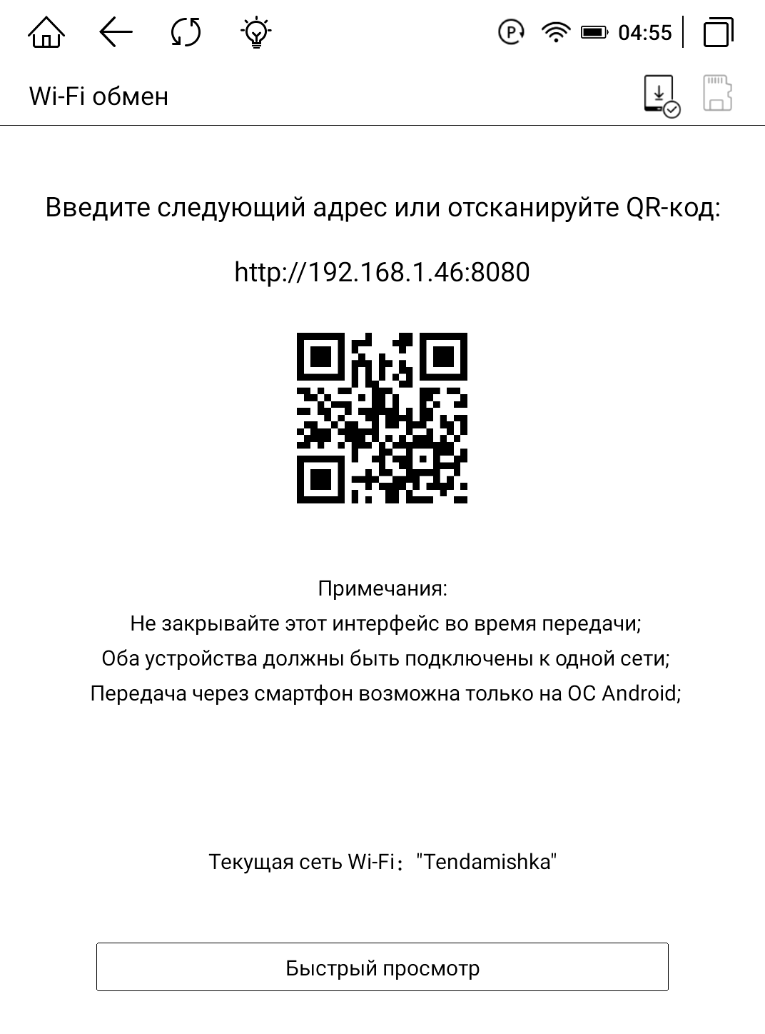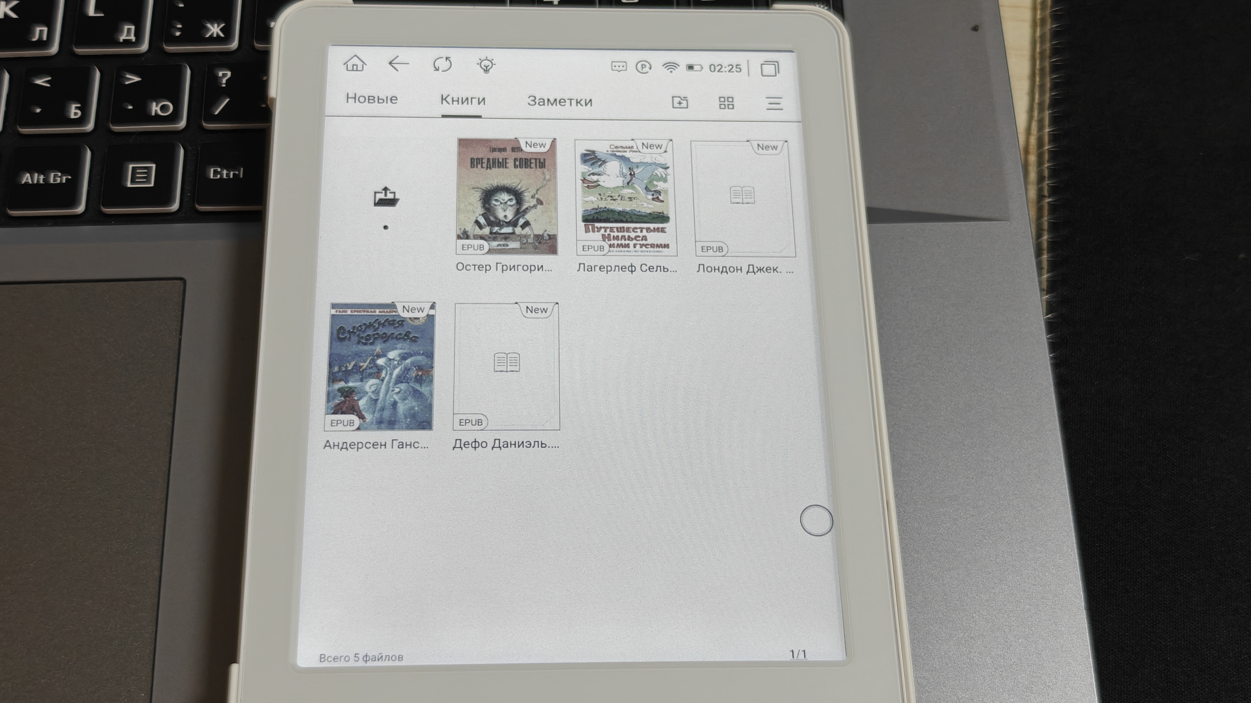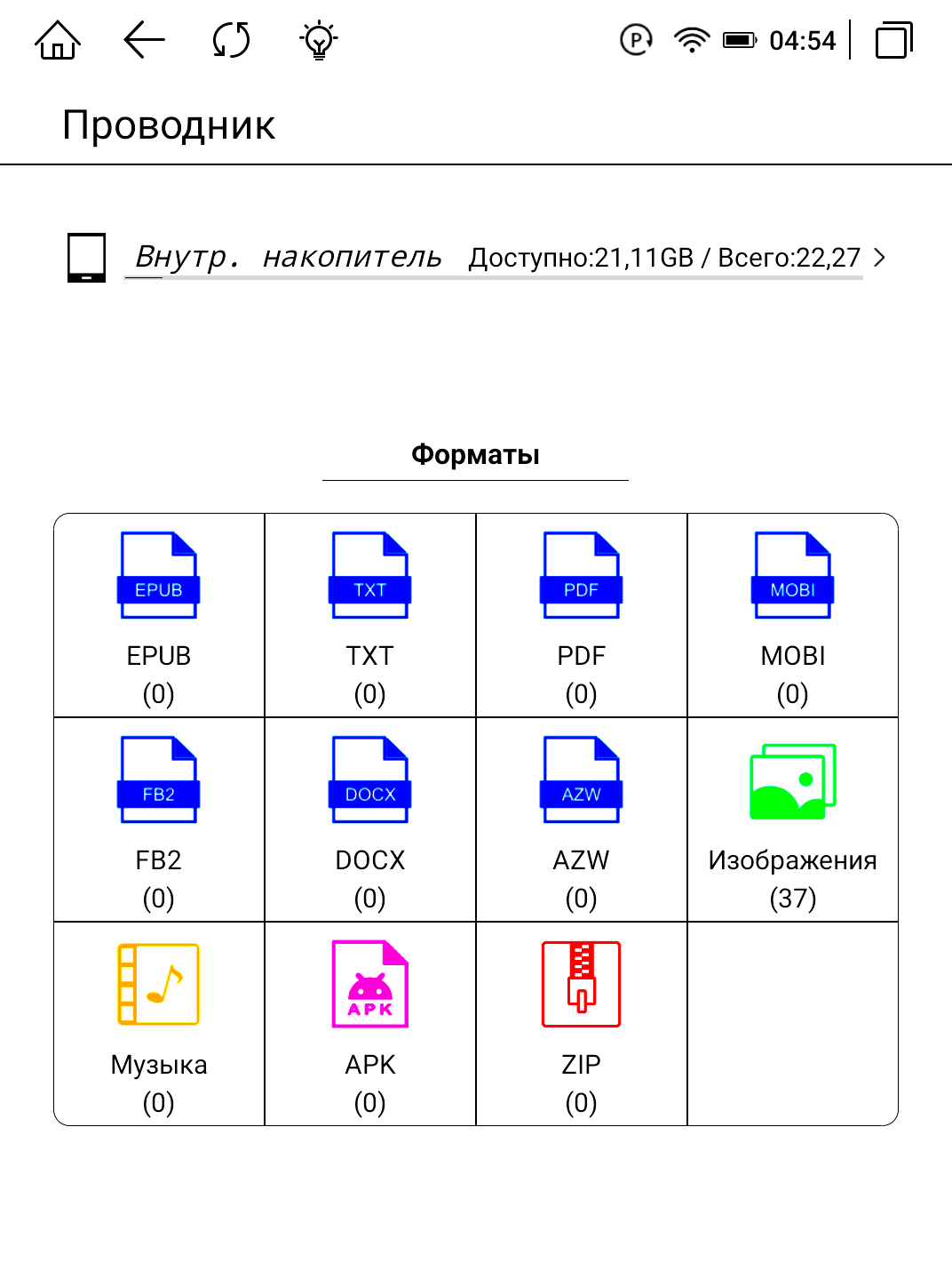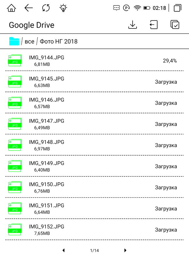 Книги, как и, собственно, любые файлы можно загрузить на книгу любым удобным для вас способом, начиная с классического копирования «по проводу», используя Wi-Fi обмен, или скачать из облачных хранилищ и с просторов интернета. При подключении кабеля аккумулятор еще и заряжается, о чем нам сообщает соответствующий индикатор. Wi-Fi обмен максимально прост. Вводим указанный на экране книги адрес в браузер ПК и простым копированием перемещаем требуемые книги. Список форматов широк и разнообразен. При подключении к ПК книжка определяется как внешнее устройство с привычной Android-системой файлов. Закачать книги так тоже не составит труда.