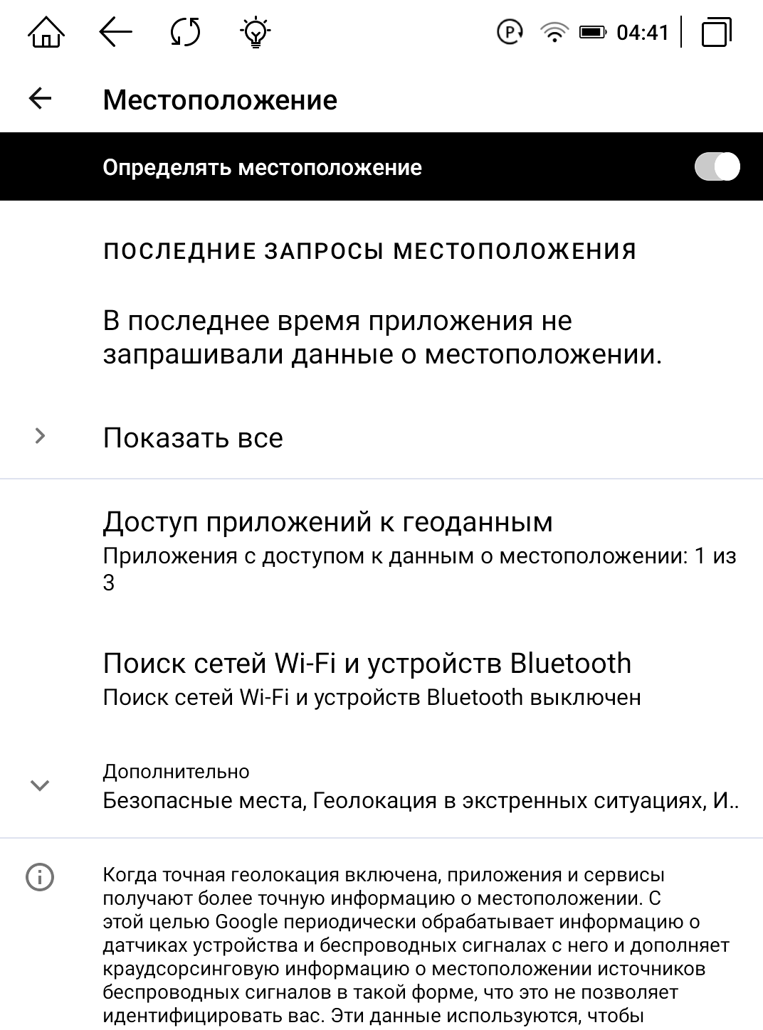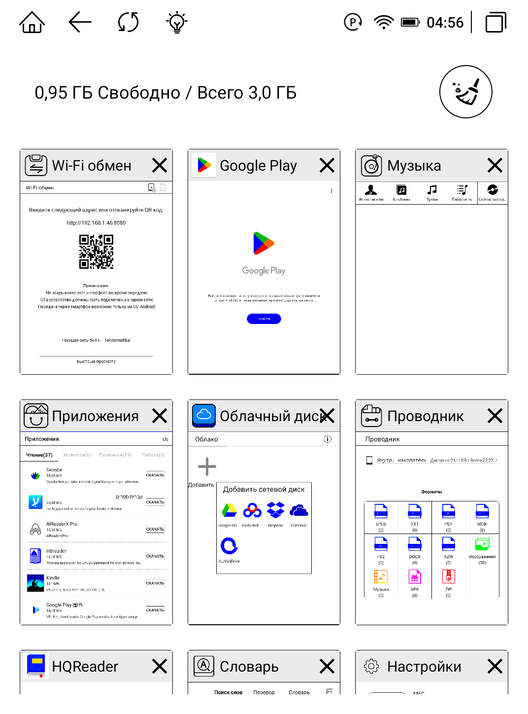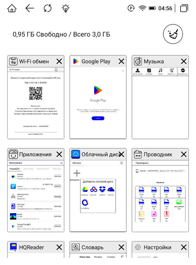 Далее на главном экране отдельными кнопками вынесены: Google Play, облачный диск, файлы, словарь (с функцией поиска слов), экранный гид (сенсорный помощник) и Wi-Fi обмен. Открытый Google Play маркет — это находка, ведь мы можем установить любое приложение для чтения, обработки текста, фотографий, а также любой мессенджер или почту, чтобы быстро делиться своим мнением или цитатами во время чтения. Так книга забирает огромный спектр задач со смартфона. Можно не только просто читать, но и выполнять привычные операции без вреда для зрения. Я проверил облачные хранилища на примере Google Drive. Мы получаем открытый доступ к онлайн-документам, что значительно увеличивает удобство общения с устройством.